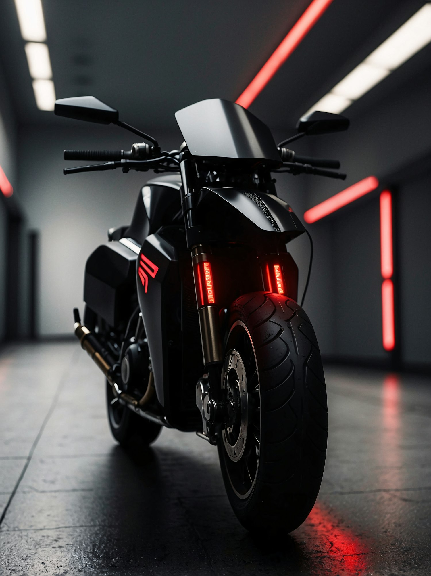 Futuristic black motorcycle with red LED lights in a dimly lit corridor, featuring sleek design and neon accents.