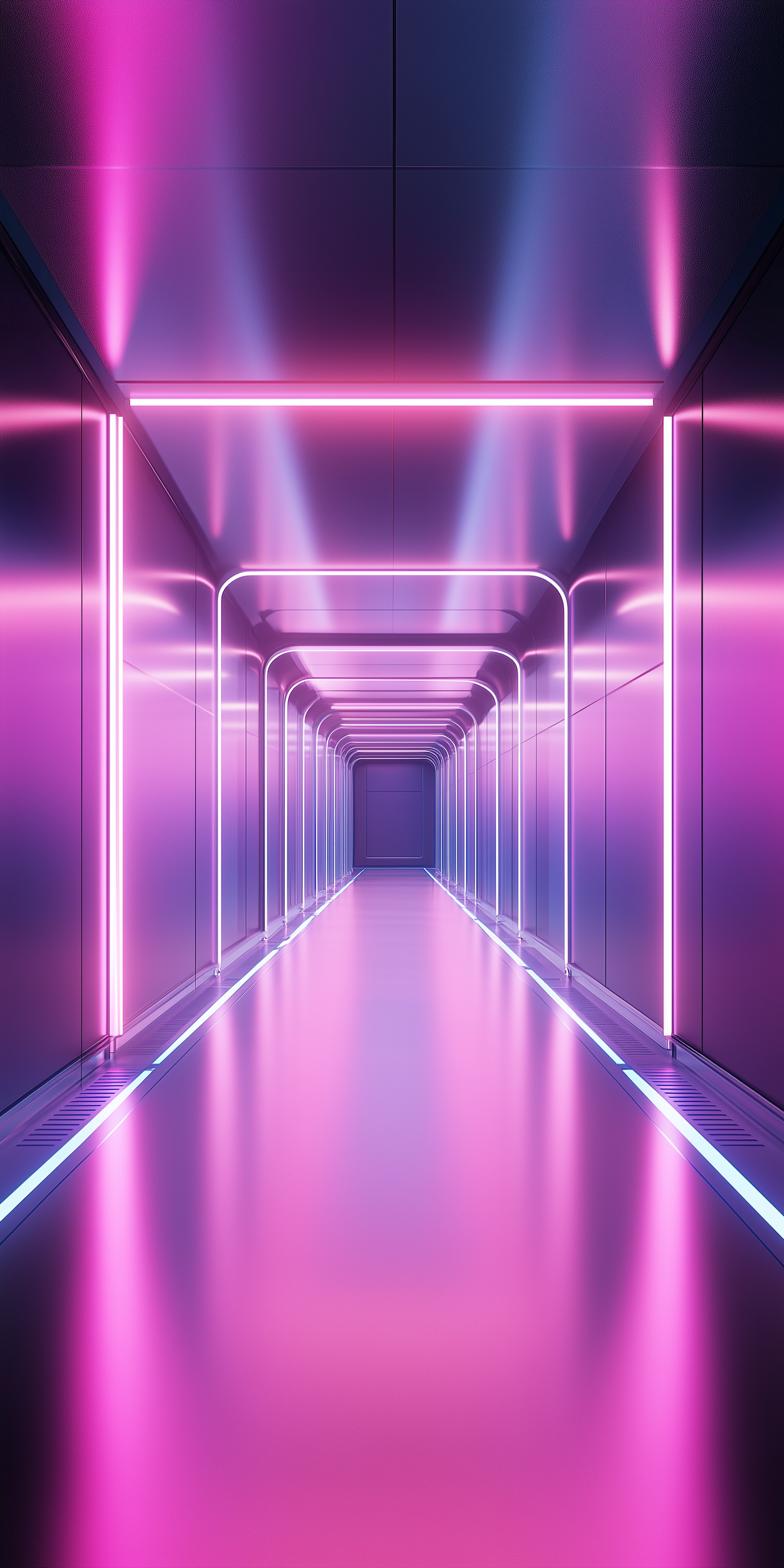 A sleek neon-lit corridor with vibrant pink and purple hues, reflective surfaces, and a futuristic, symmetrical design.