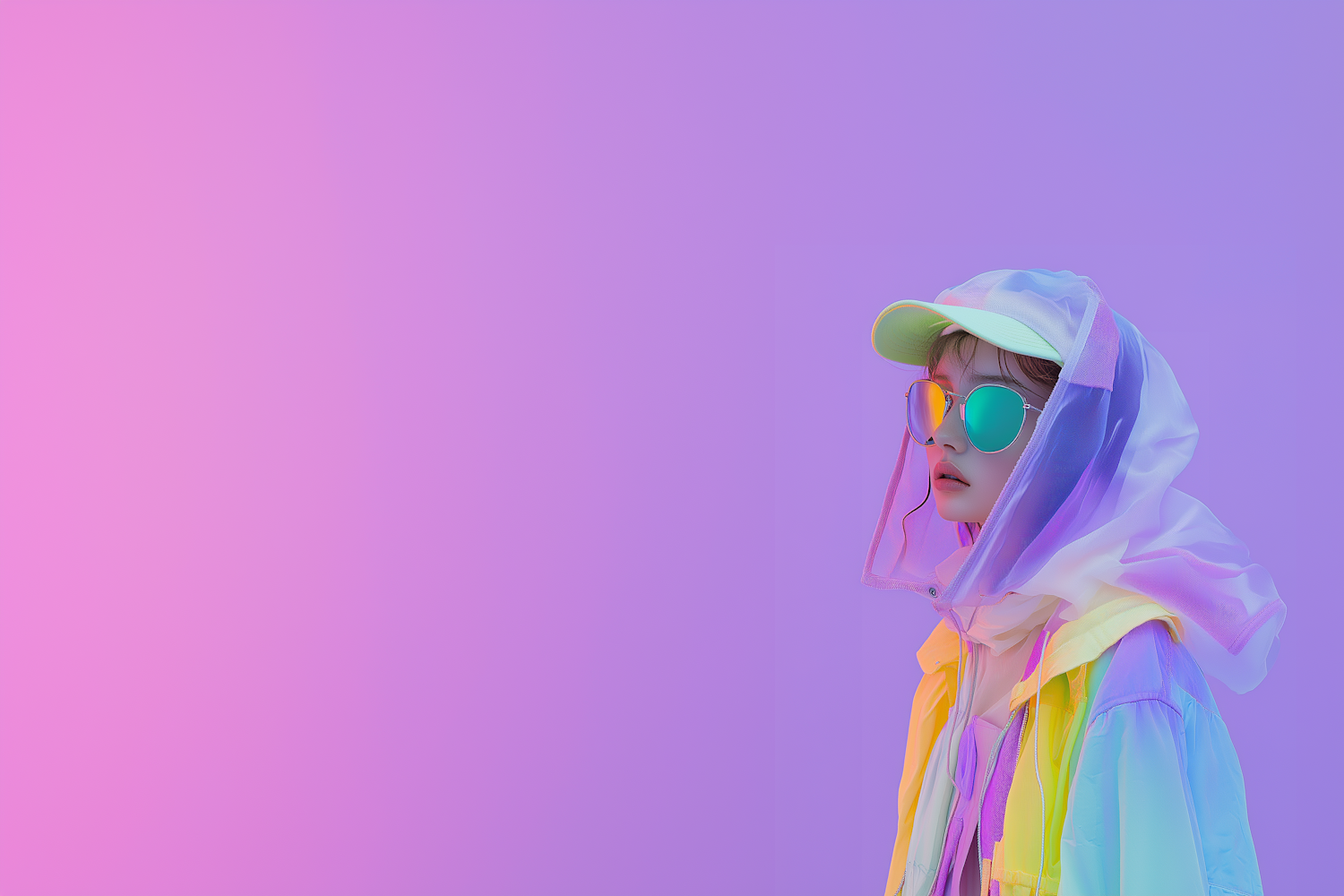 Stylish person in neon green cap, rainbow sunglasses, and iridescent hood against a pink-purple gradient background.