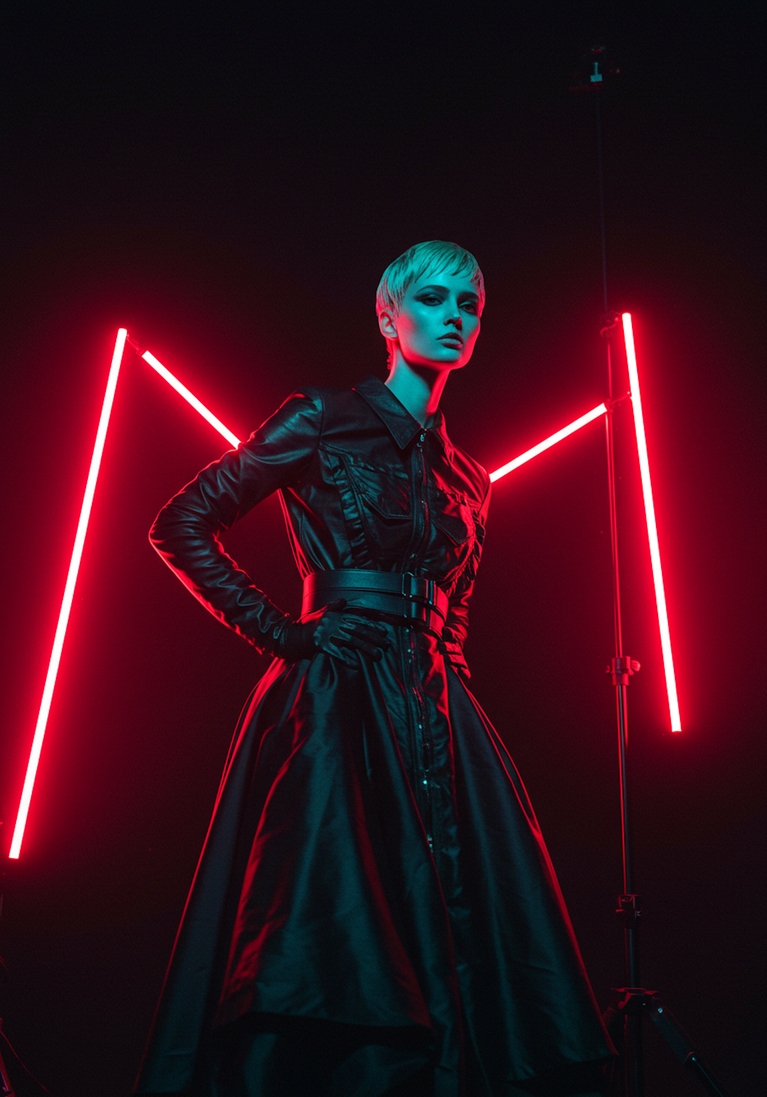 Futuristic portrait of a woman in a black leather coat, set against bold red neon lights in a dark, edgy setting.