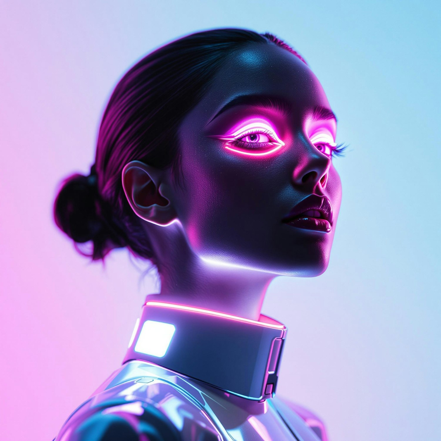 Futuristic portrait of a woman with glowing neon accents, sleek hairstyle, and a high-tech collar against a pink and blue gradient background.