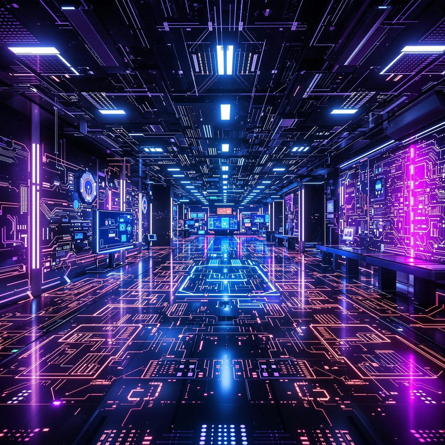 A neon-lit futuristic room with glowing circuit patterns, holographic displays, and vibrant pink, purple, and blue lights.