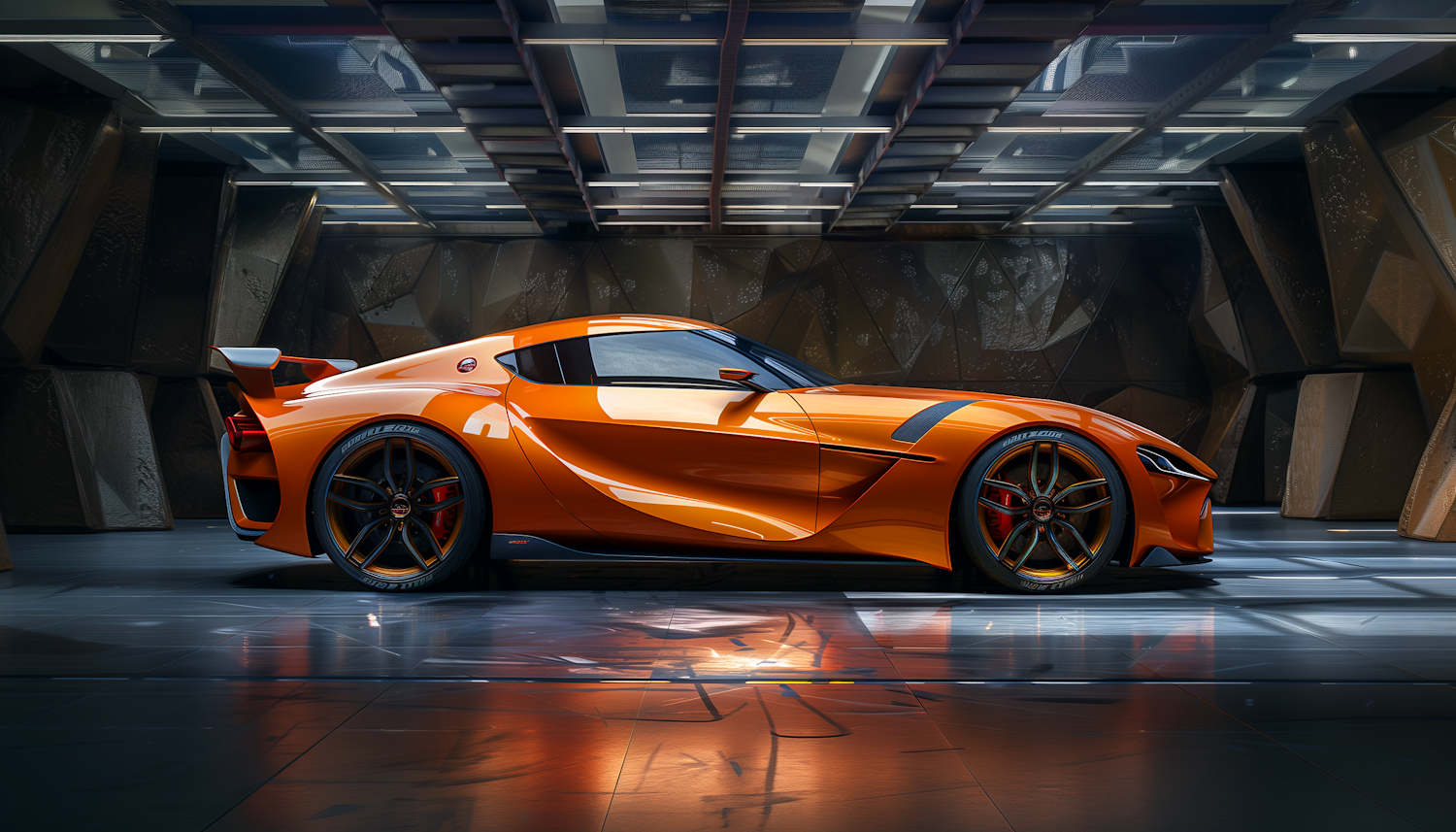 Futuristic orange sports car with sleek design in a modern garage, featuring sharp lines and a prominent rear spoiler.