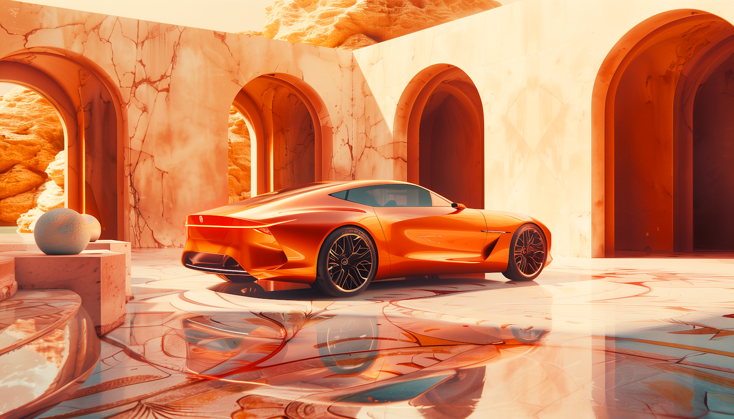 Futuristic orange sports car in a luxurious marbled courtyard with arched walls and artistic sculptures.