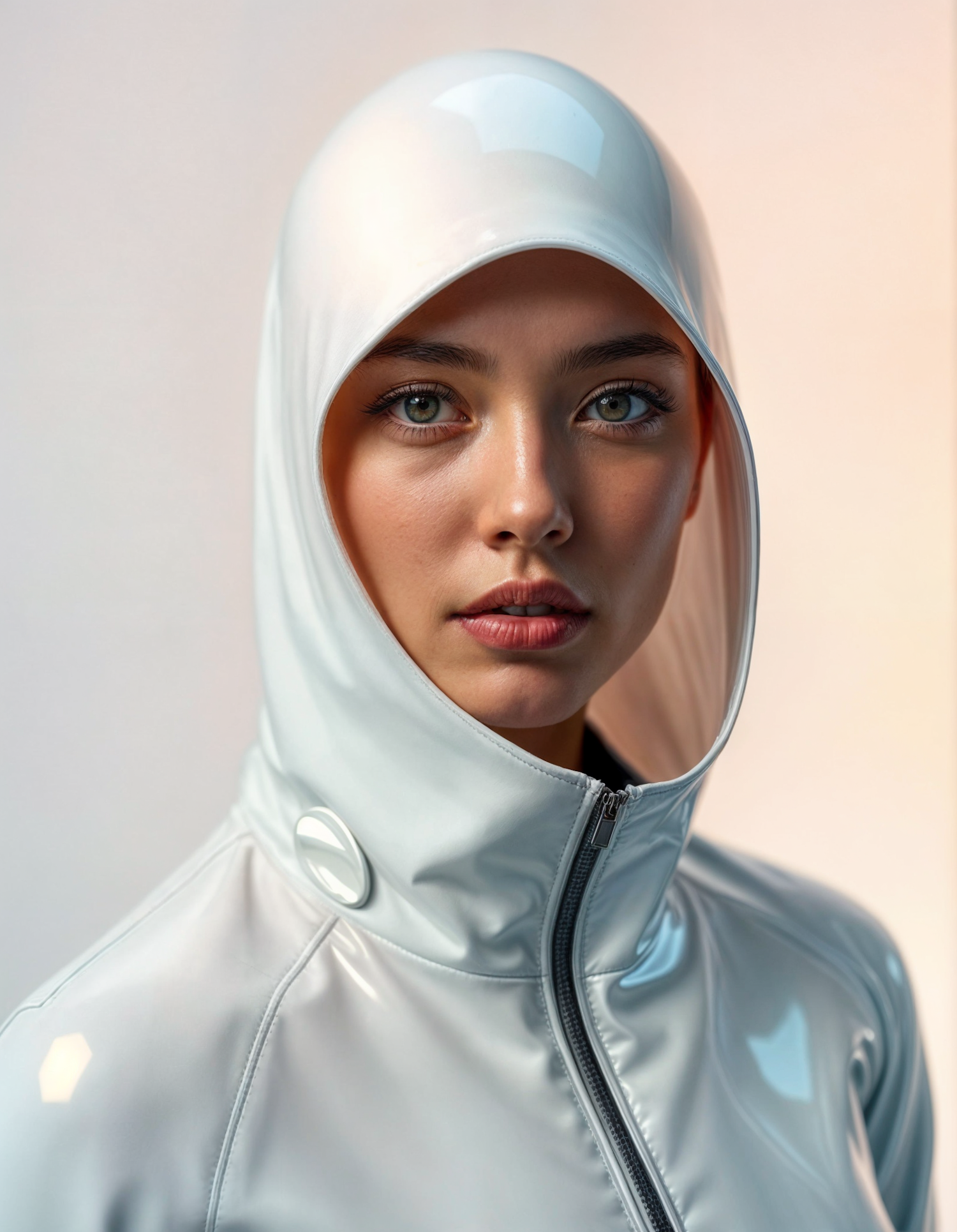 A woman in a glossy white hooded jacket with striking green eyes and a calm expression, set against a soft gradient background.