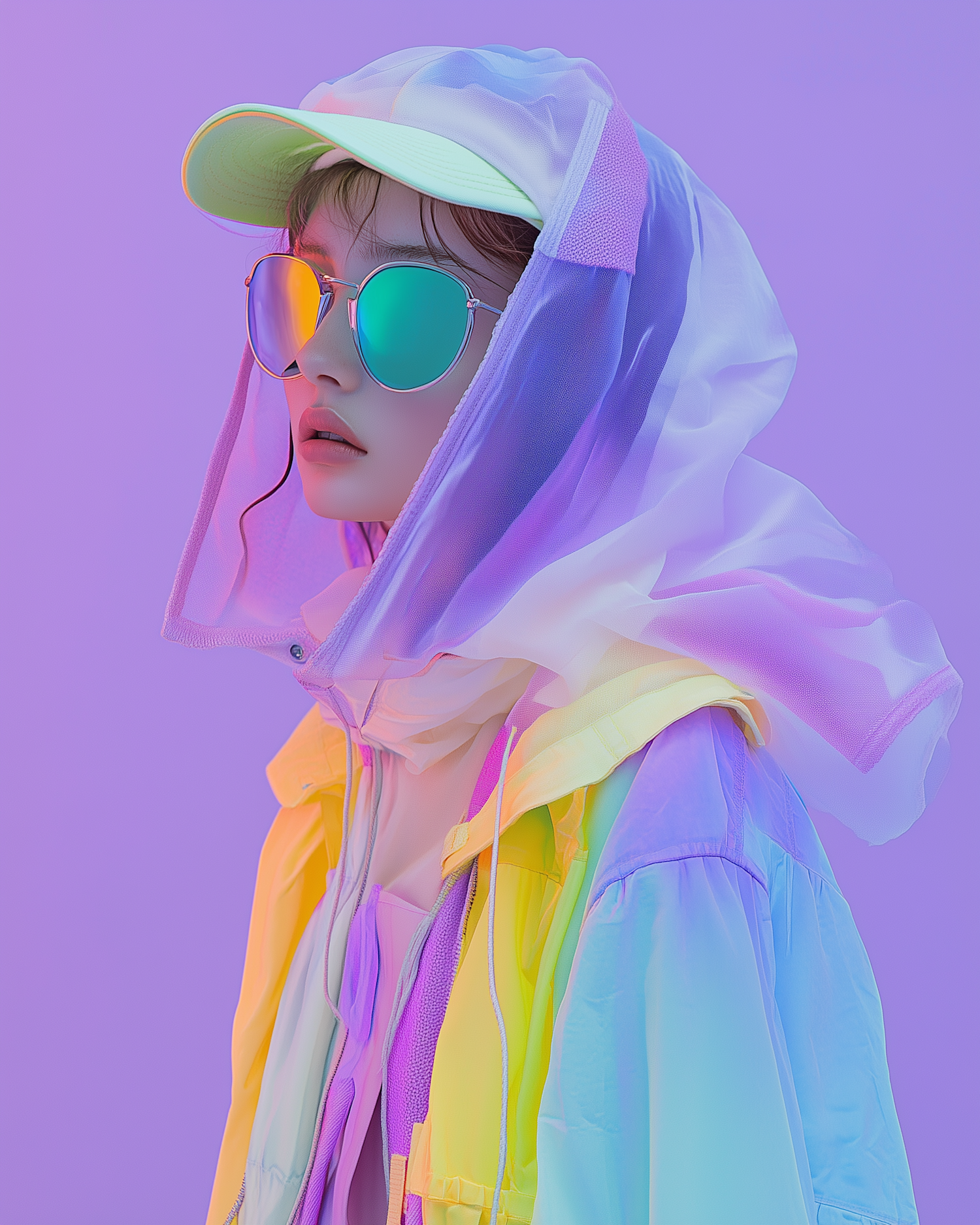 Futuristic pastel fashion with reflective sunglasses, a translucent hood, and a gradient jacket against a lavender backdrop.