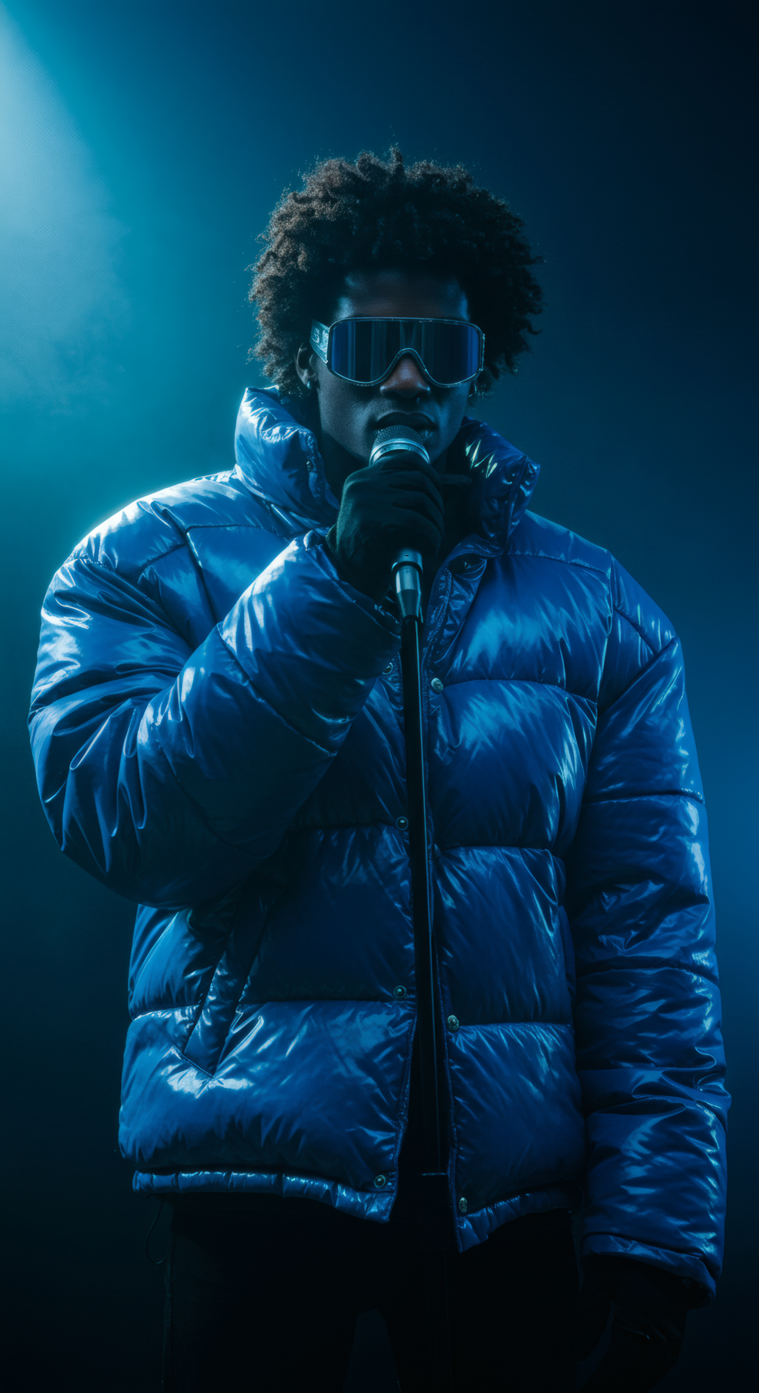 A man in a shiny blue puffer jacket and reflective sunglasses holds a microphone against a dark blue background.