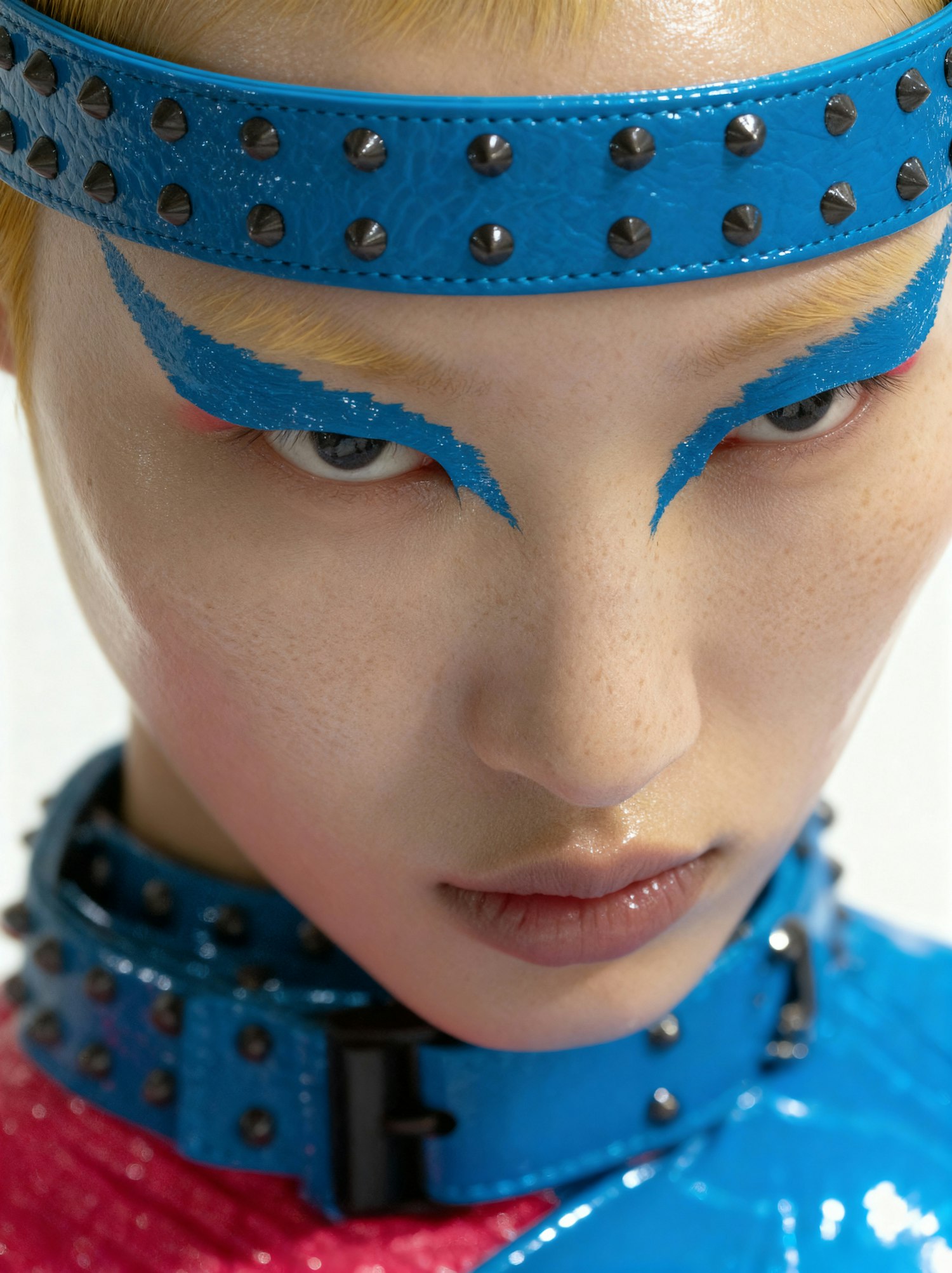 Close-up of a person with bold blue eyeliner and studded blue accessories, showcasing a futuristic and edgy style.