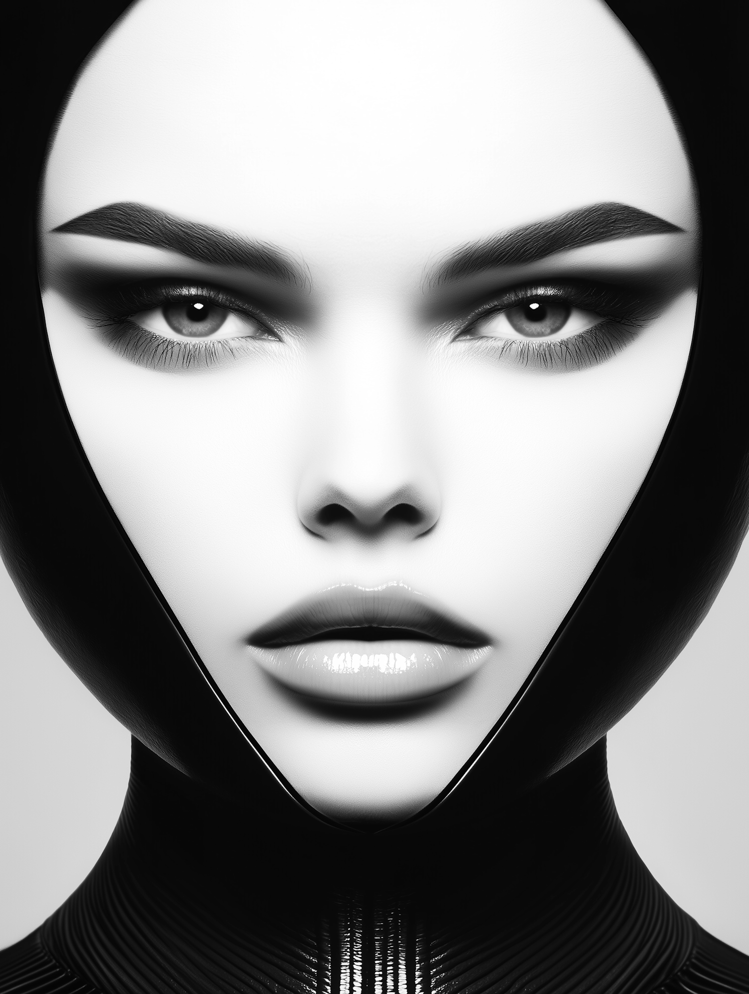 Futuristic black-and-white digital art of a stylized female face with bold features and a sleek, high-tech aesthetic.