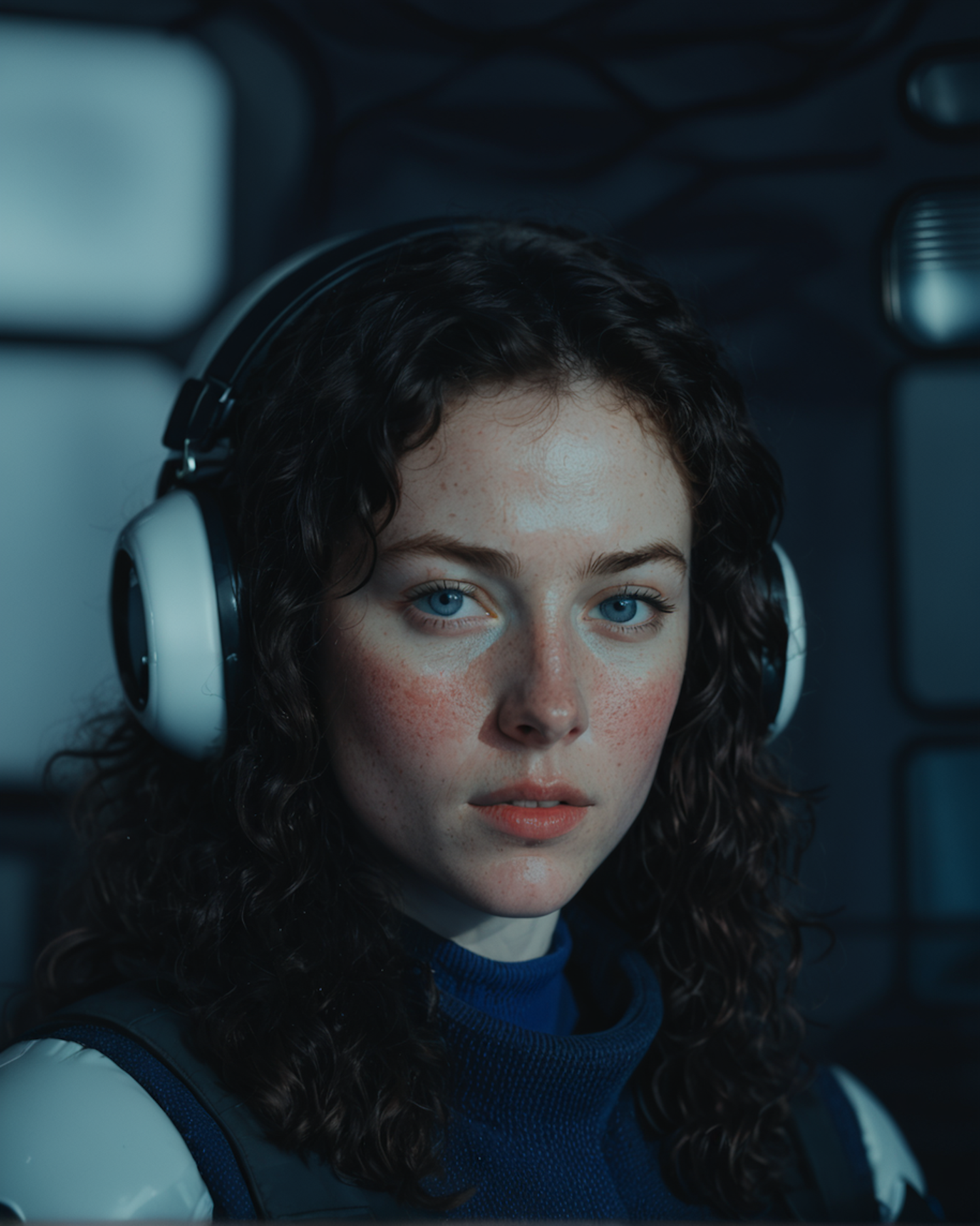 Close-up of a woman with curly hair, freckles, and blue eyes wearing futuristic white headphones in a dimly lit, modern setting.