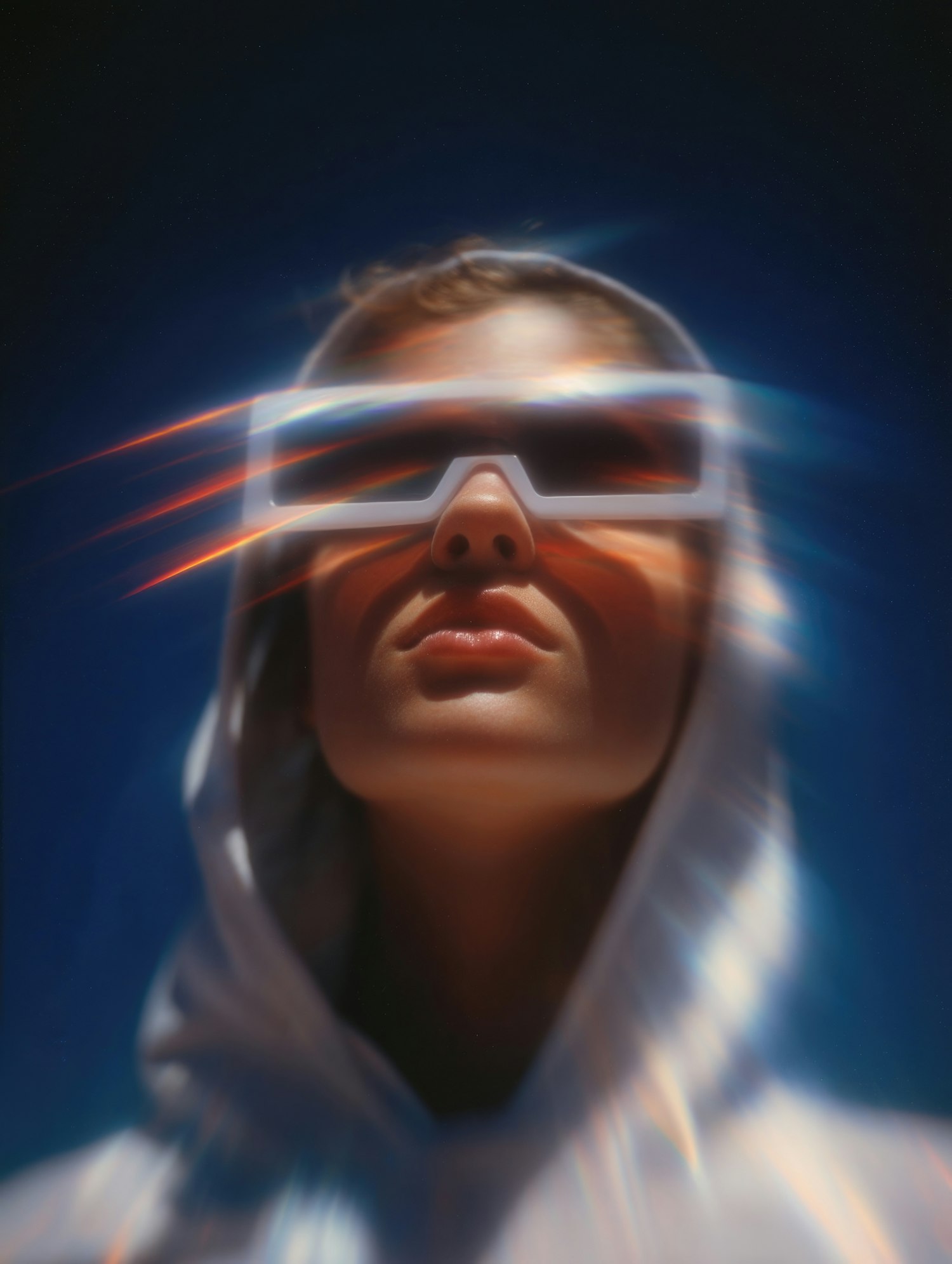Futuristic portrait of a person in a white hoodie and reflective sunglasses, with prismatic light effects against a deep blue background.