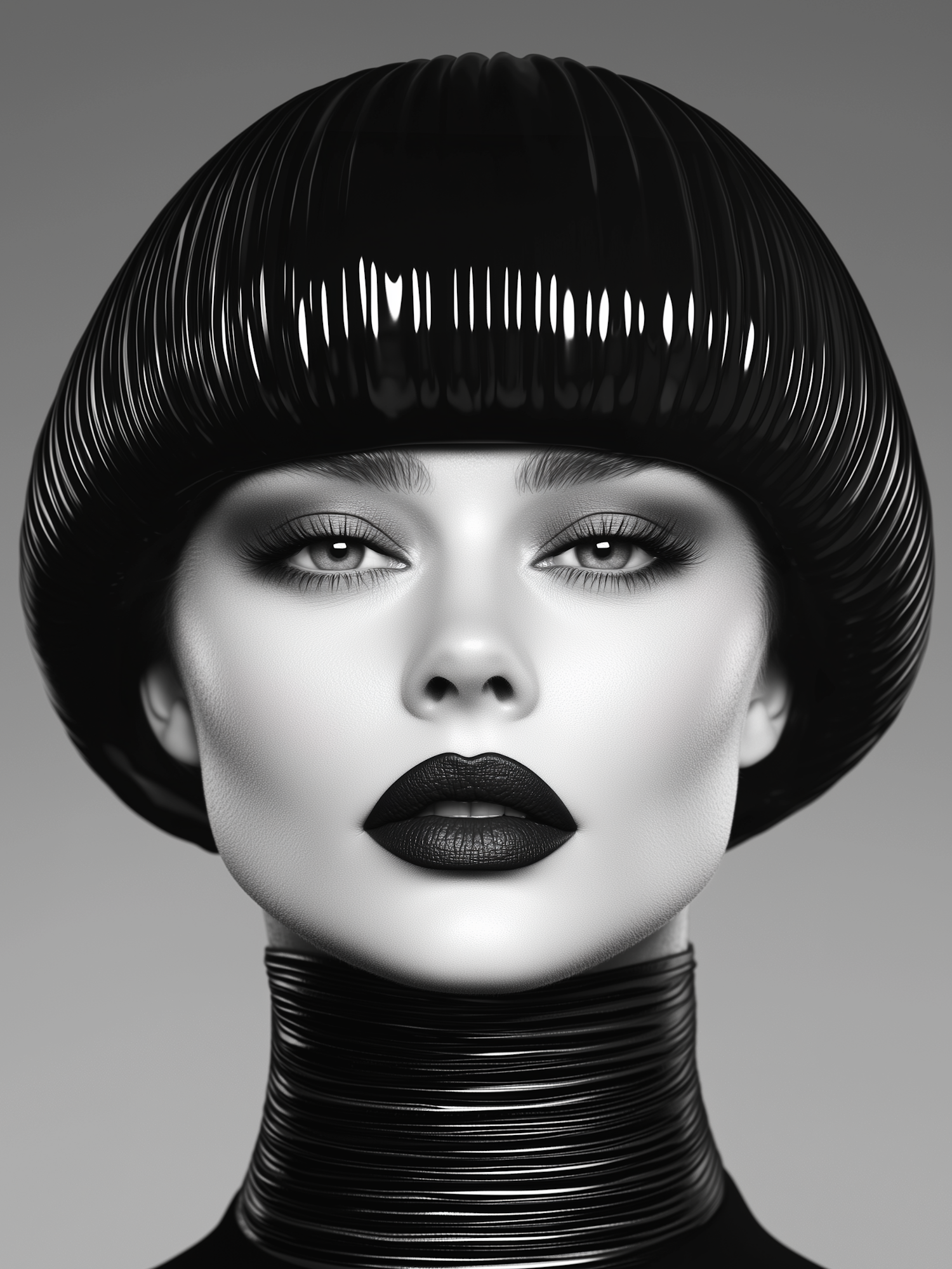 Futuristic black and white portrait of a woman with glossy helmet-like hair and dramatic makeup, exuding a bold, avant-garde style.