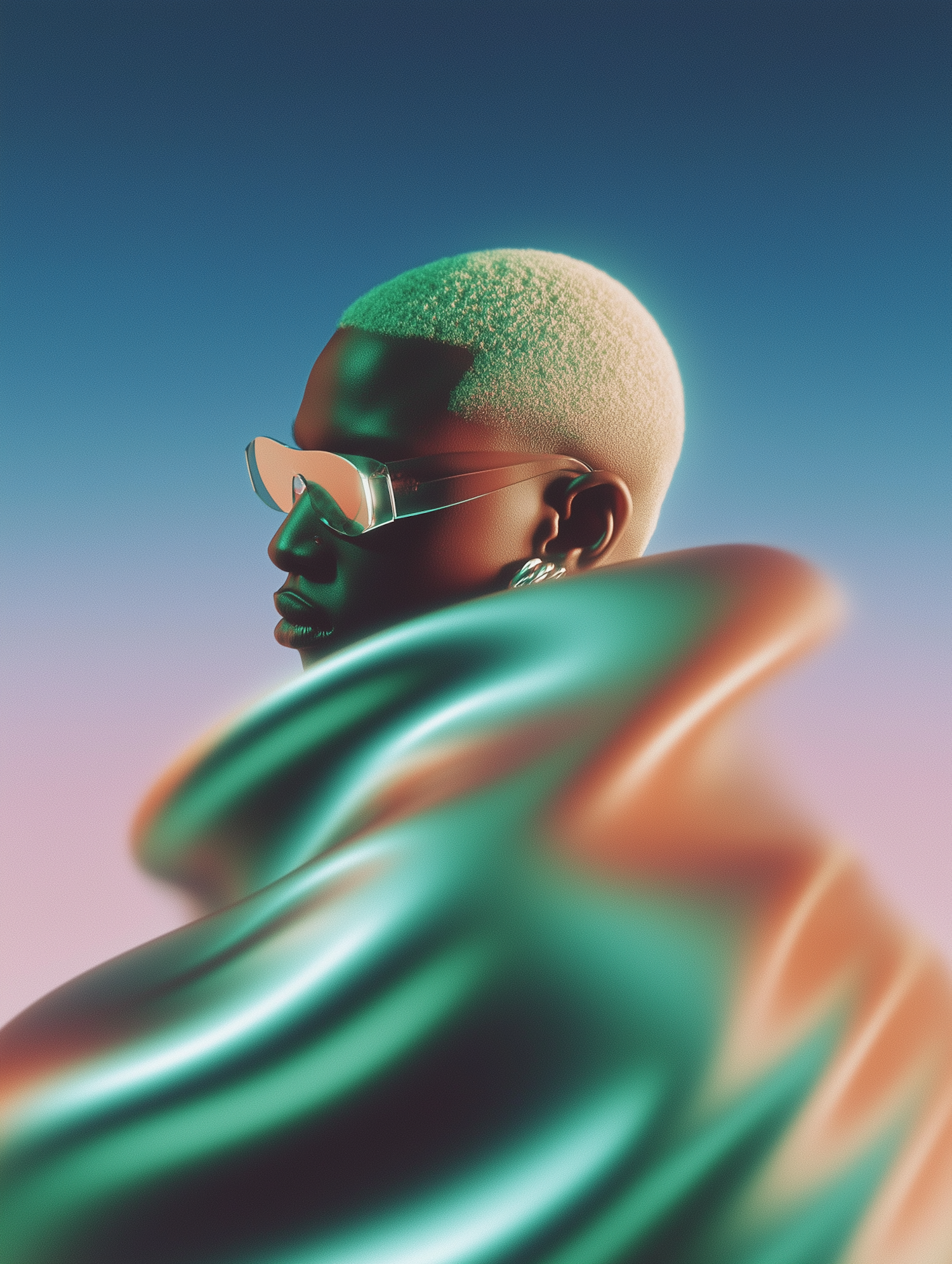 Stylized portrait of a person with short hair, futuristic glasses, and metallic fabric, set against a gradient blue and pink background.