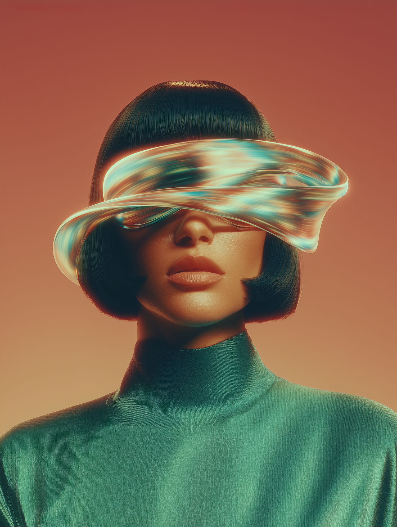 A futuristic portrait of a person with a sleek bob haircut, a metallic band over their eyes, and a shimmering green outfit.
