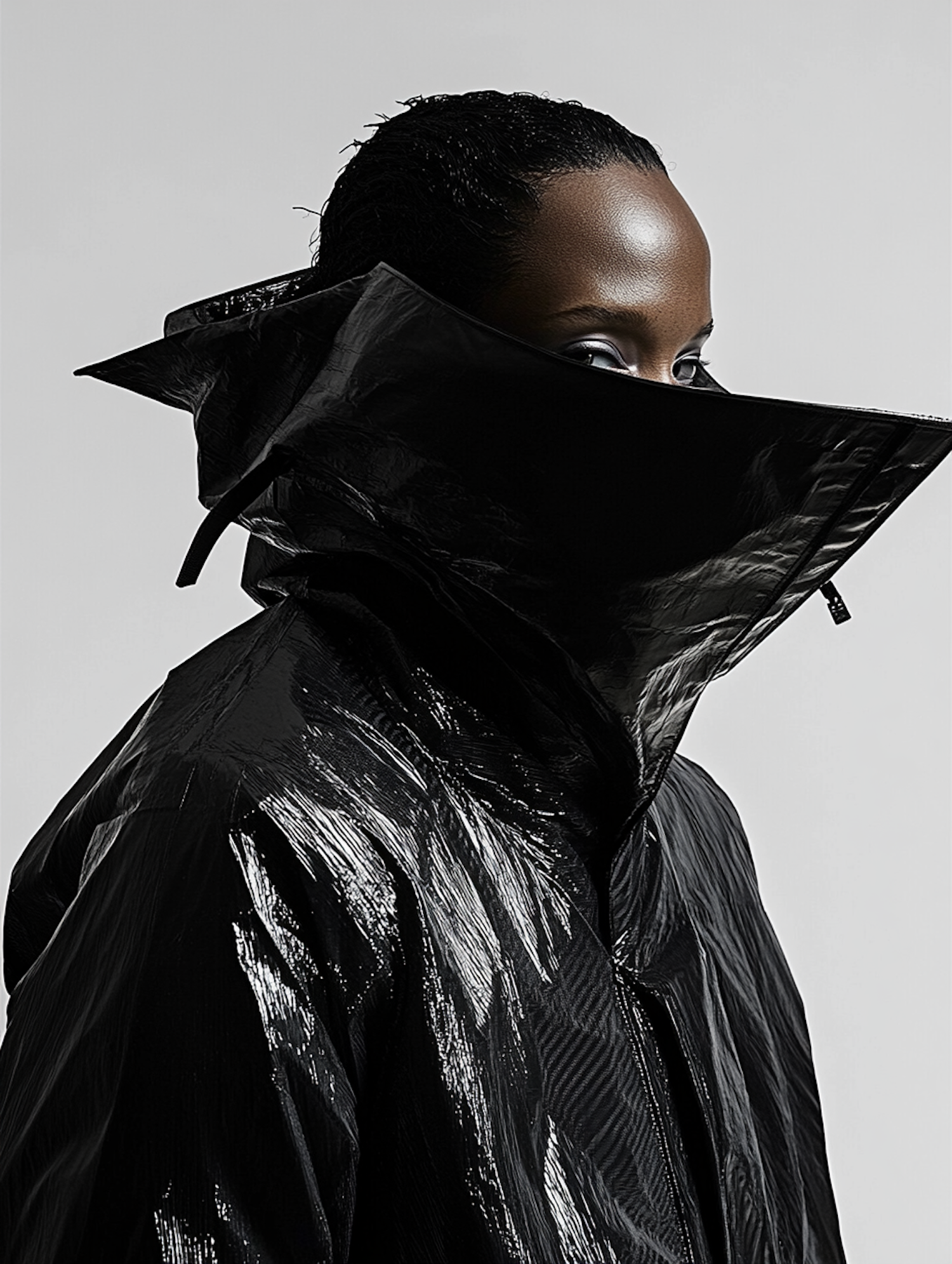 Futuristic portrait of a person in a glossy black jacket with a high collar, reflecting light. Intense gaze and sleek design stand out.
