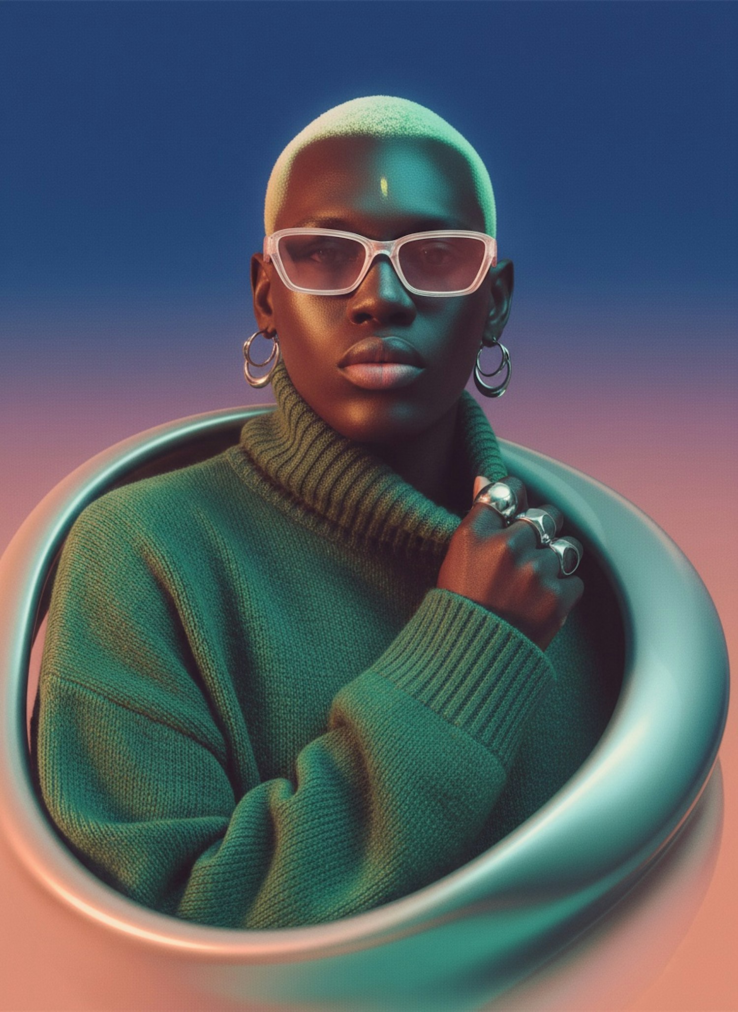 Stylish portrait of a person in a green sweater, glasses, and silver accessories, set against a vibrant gradient background.