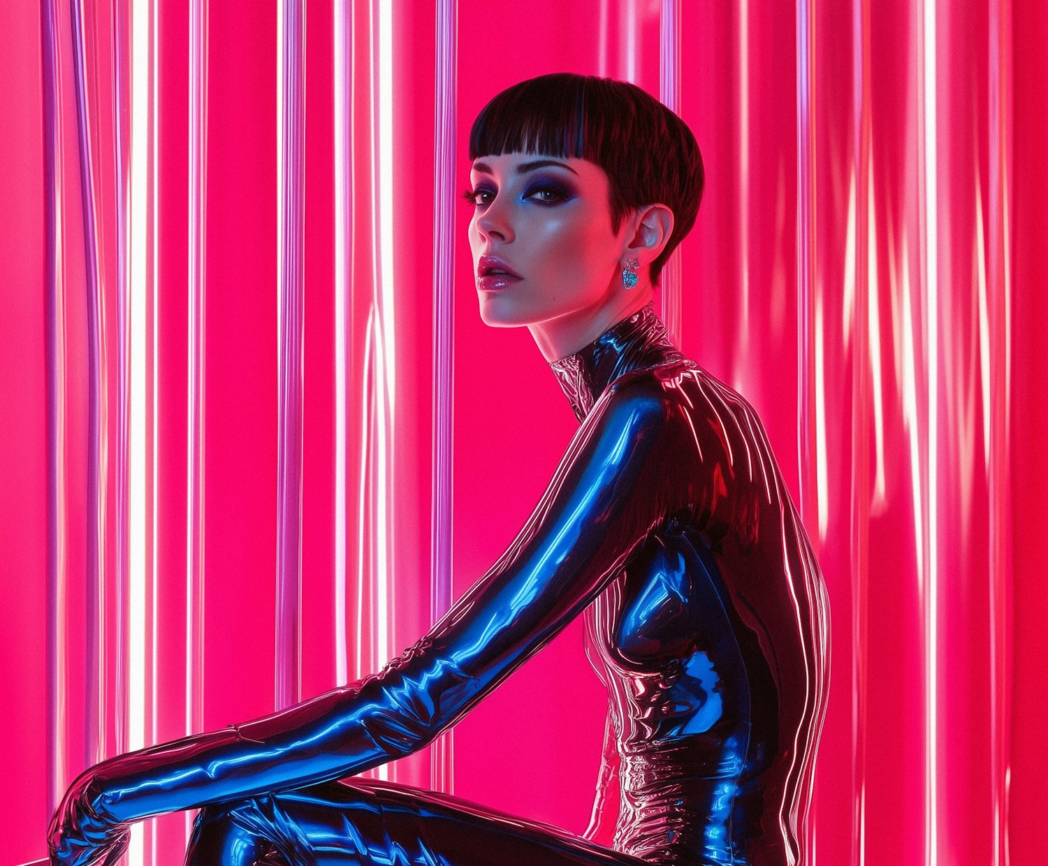Woman in shiny black latex outfit against vibrant pink neon background, exuding a futuristic and edgy vibe.