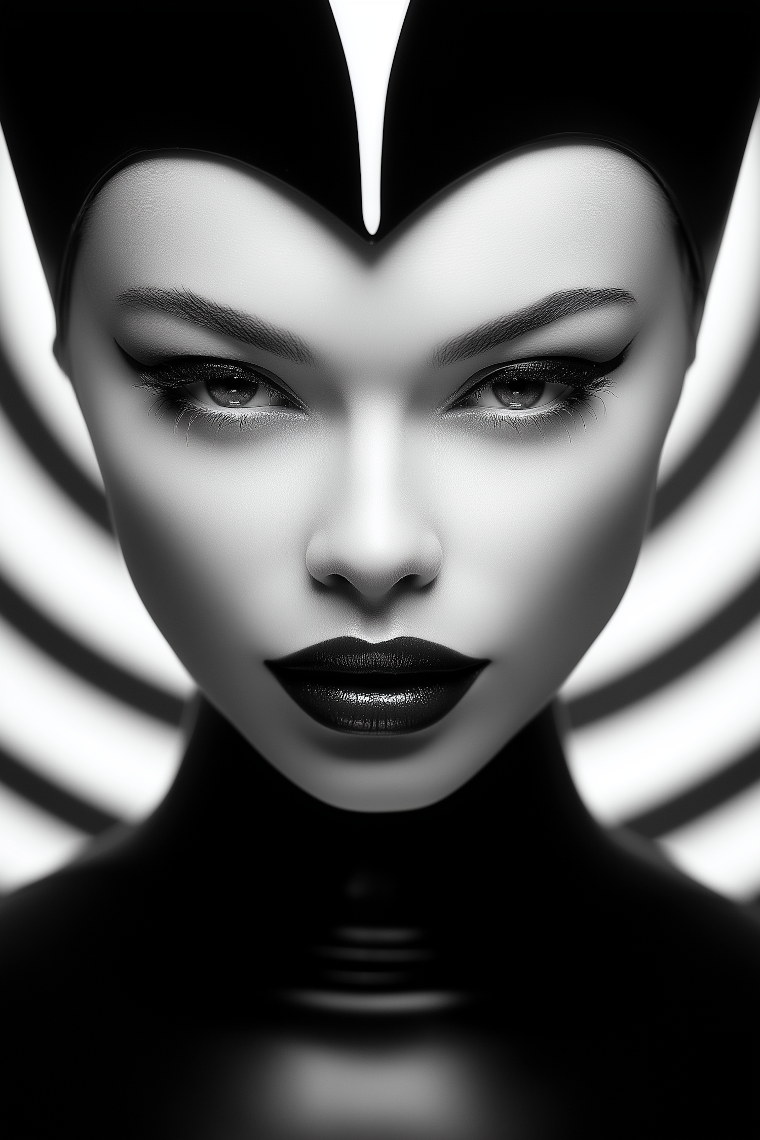 A bold black-and-white portrait showcasing a futuristic aesthetic with dramatic makeup and a sleek headpiece.