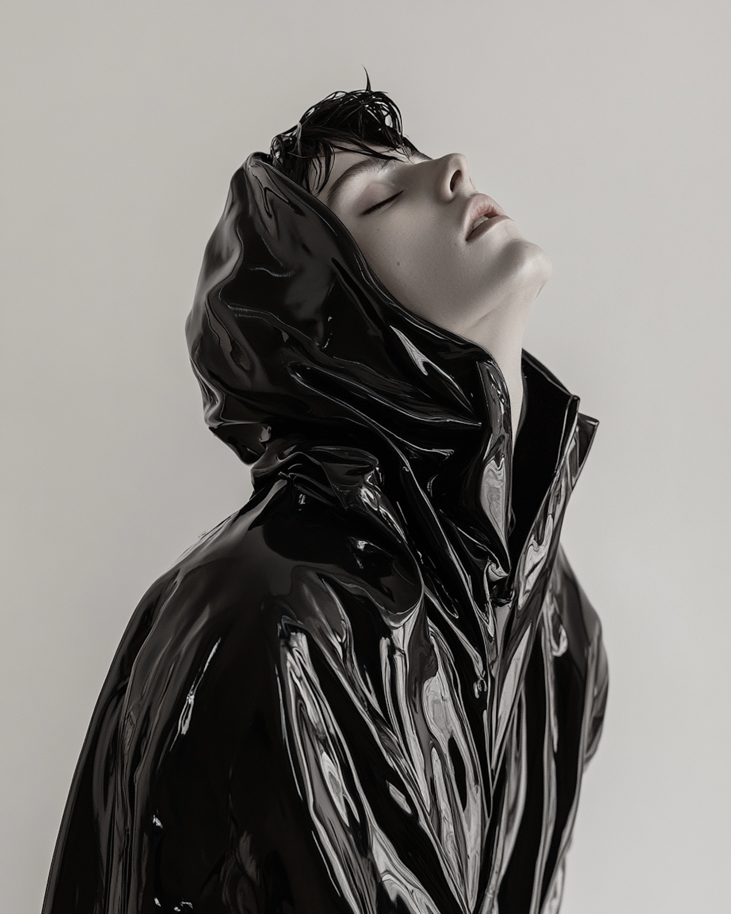 A person in a glossy black hooded jacket tilts their head back with closed eyes, creating a serene and futuristic vibe.