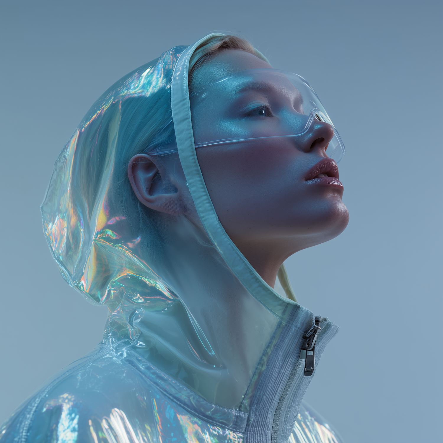 Futuristic portrait of a person in an iridescent hooded jacket and clear eyewear, set against a soft blue gradient background.