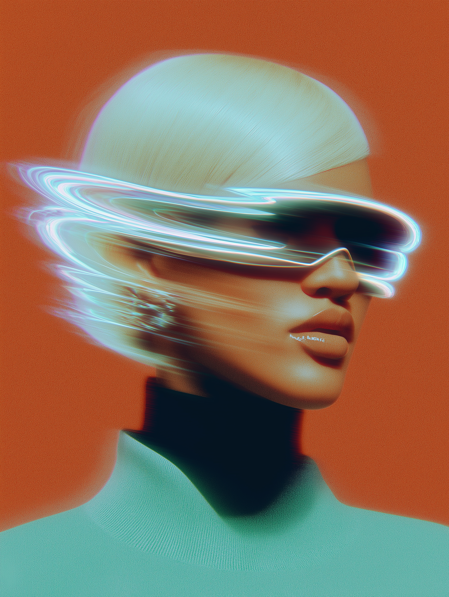 Futuristic portrait of a person with platinum blonde hair, glowing eyewear, and a vibrant orange background.