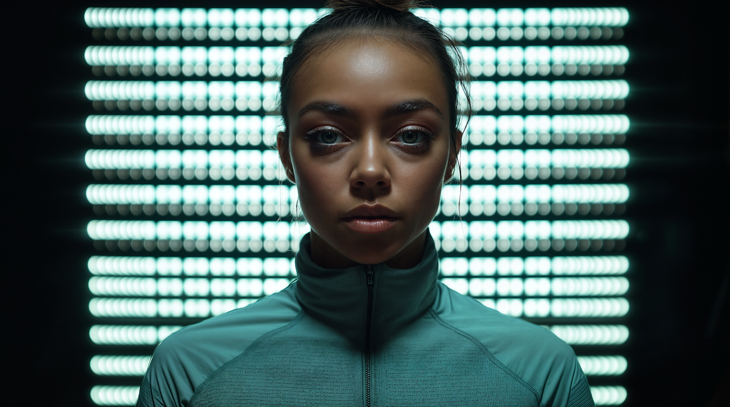 A young woman in a teal athletic jacket against a glowing teal light grid, exuding focus and intensity in a futuristic setting.