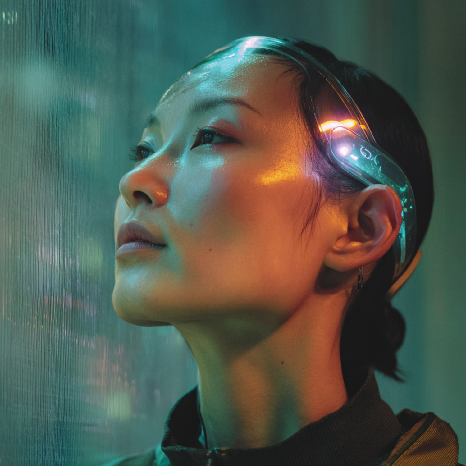 A futuristic portrait of a person wearing a glowing headband, with vibrant lighting and a contemplative expression.