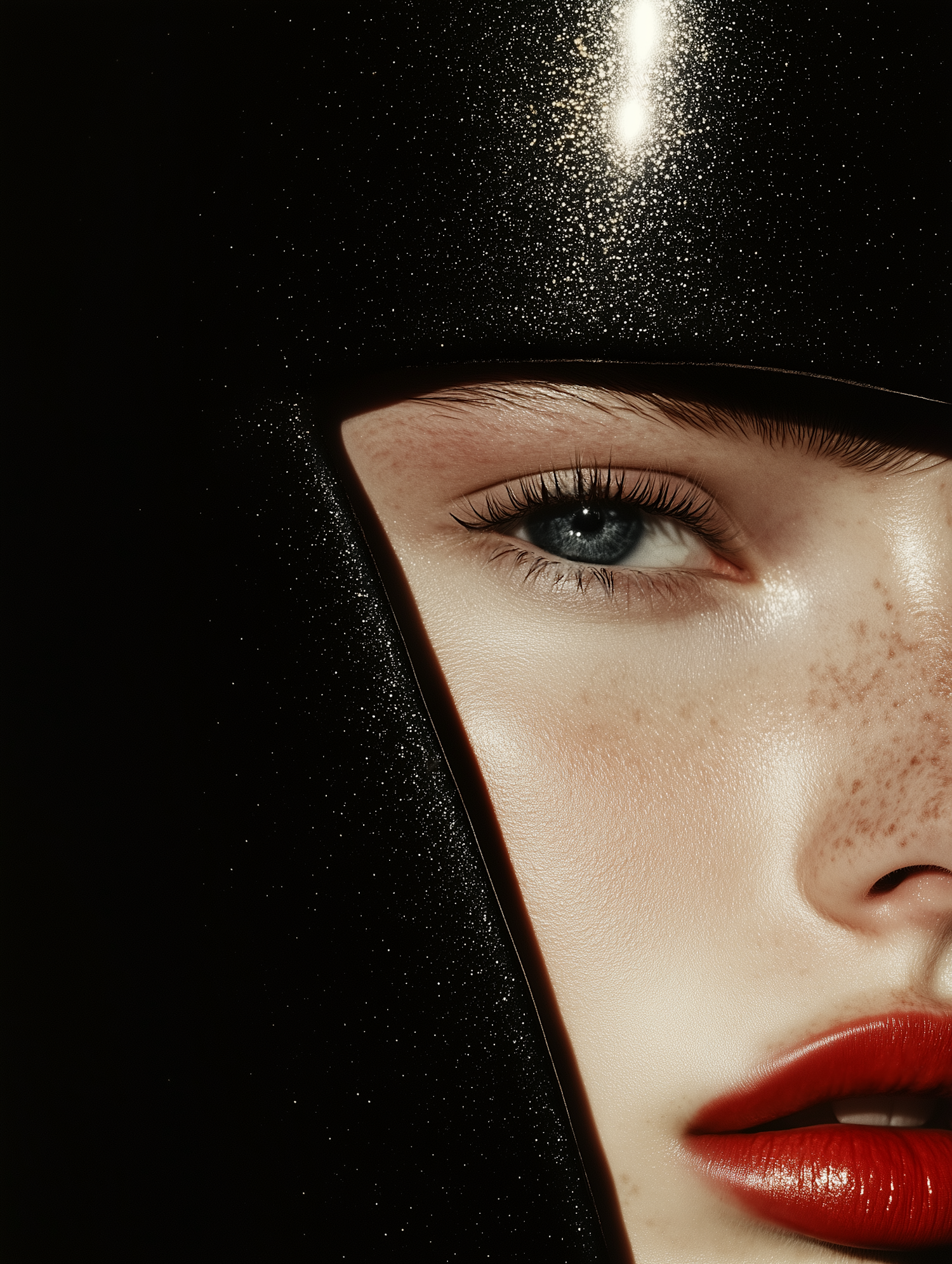 Close-up of a freckled face with blue eyes, glossy red lips, and a sleek black helmet reflecting light for a futuristic vibe.