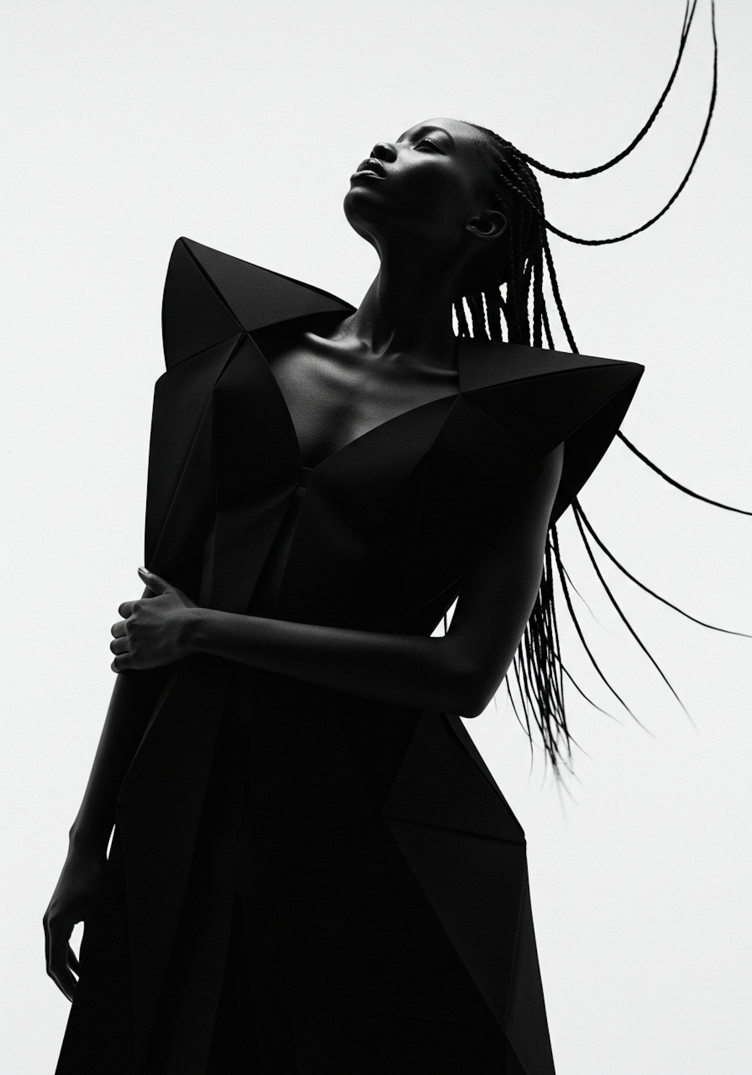 A bold black-and-white portrait of a woman in a geometric outfit, with braided hair and a serene upward gaze, exuding futuristic elegance.