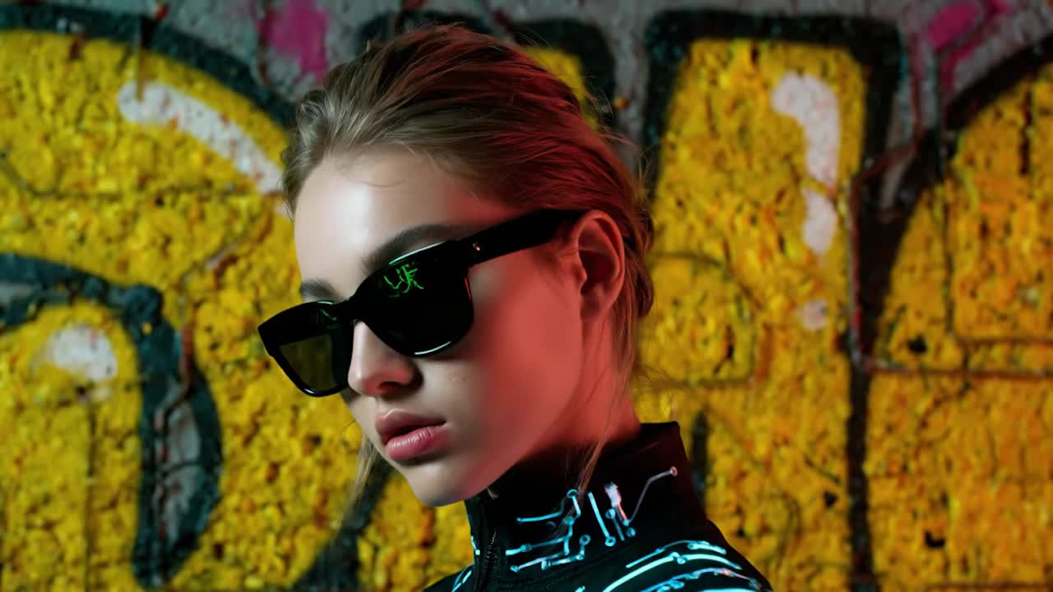 Stylish individual in futuristic attire with glowing patterns, posing against a vibrant graffiti wall with dramatic lighting.