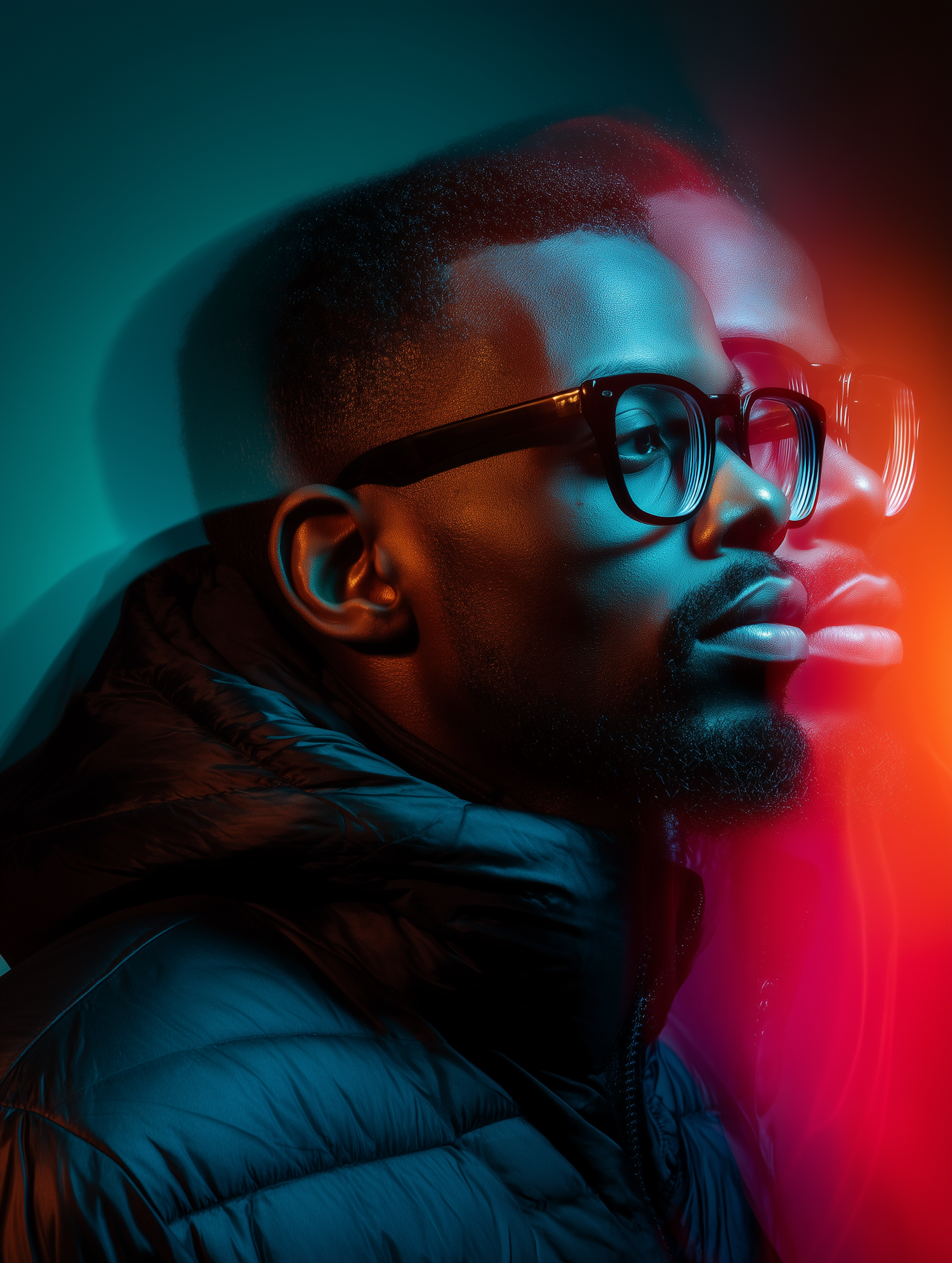 A creative double-exposure portrait of a man in glasses, with vibrant red and blue lighting creating a futuristic vibe.