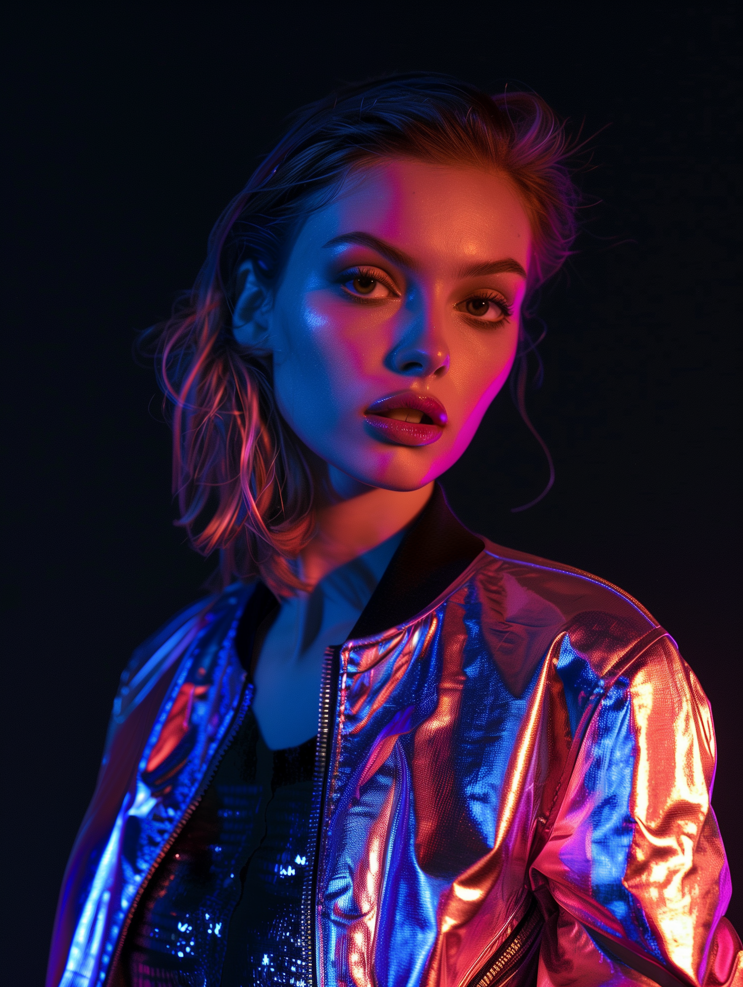 A young woman in a metallic jacket with vibrant pink and blue lighting, creating a dramatic and modern fashion look.