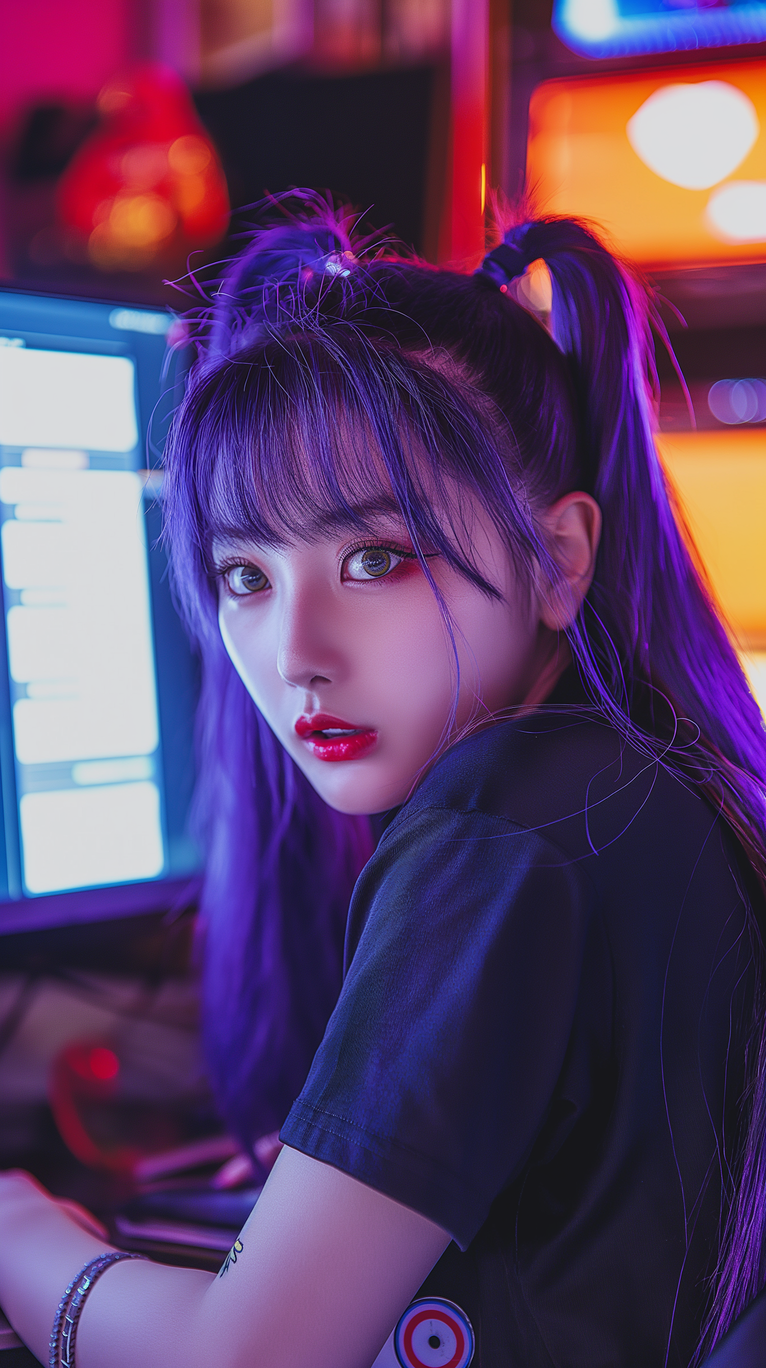 Cyberpunk-inspired portrait of a woman with purple hair, bold makeup, and neon lighting, creating a futuristic and vibrant aesthetic.