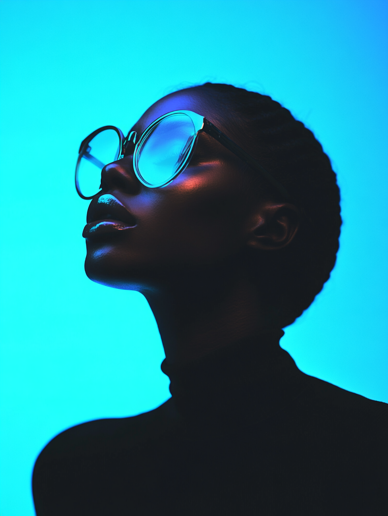 A bold portrait of a woman in reflective glasses, glowing under vibrant blue lighting with a futuristic and artistic vibe.