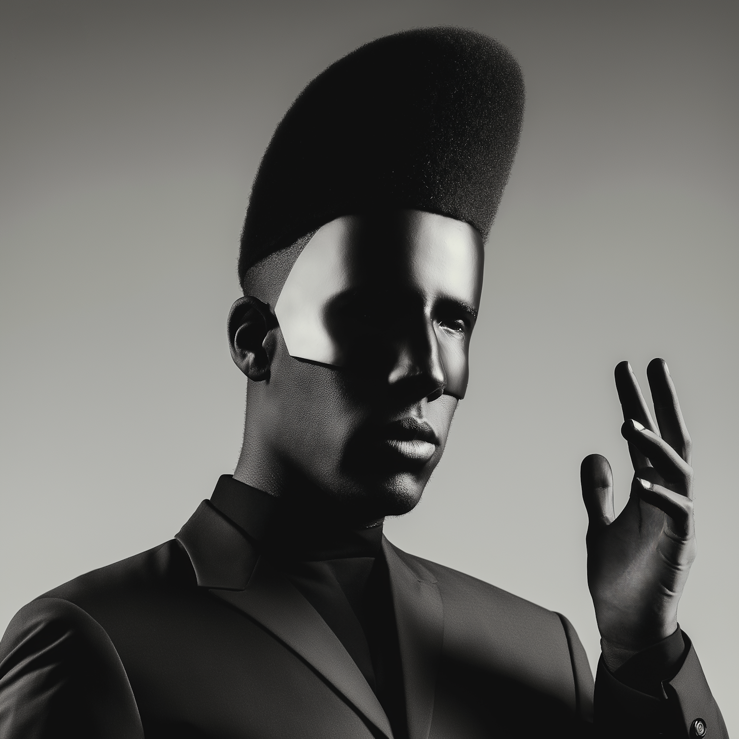 Futuristic portrait of a black man with a high-top fade and metallic mask, wearing a dark suit. Dramatic pose with raised hand.