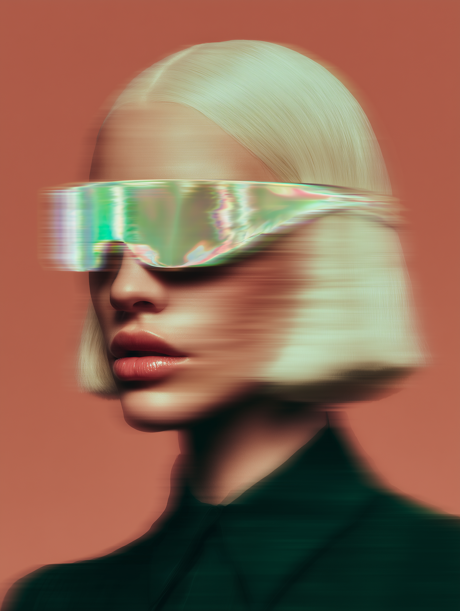A futuristic portrait featuring a person with platinum blonde hair, iridescent visor glasses, and a sleek aesthetic against a warm background.