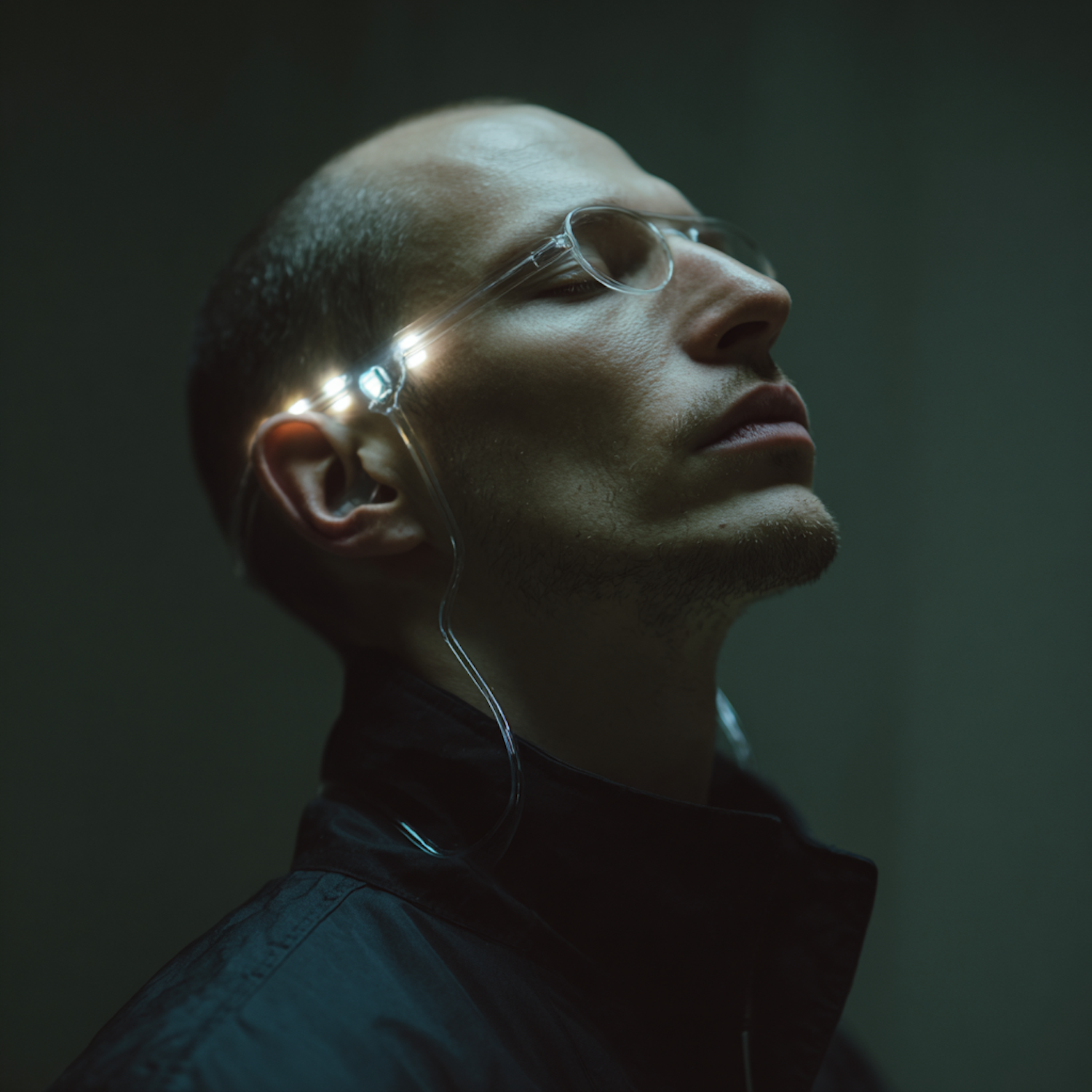 A man wearing illuminated futuristic glasses in a dimly lit setting, exuding a calm and introspective vibe.