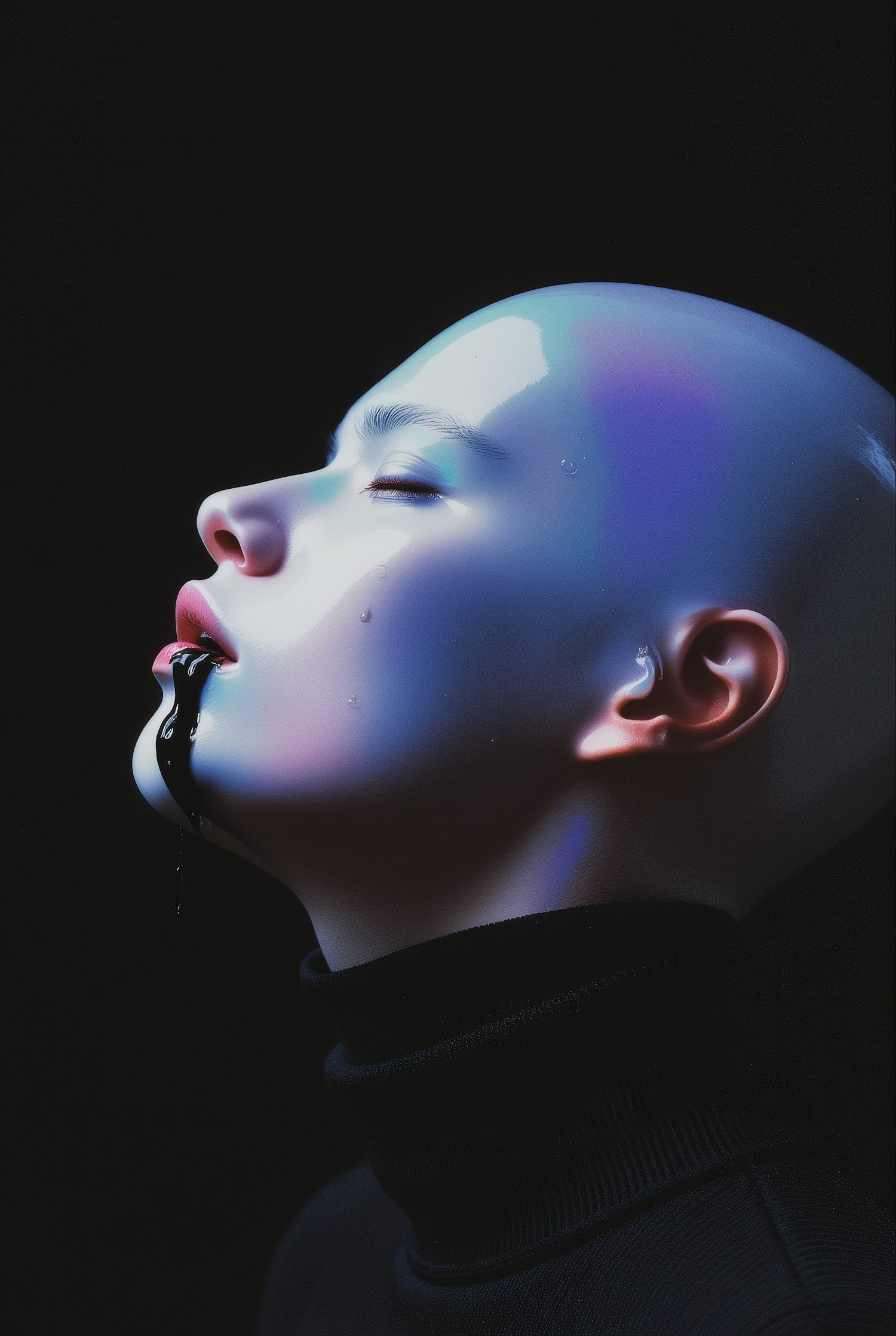 A surreal portrait of a person with glossy skin and colorful lighting, featuring a dark liquid dripping from their mouth.