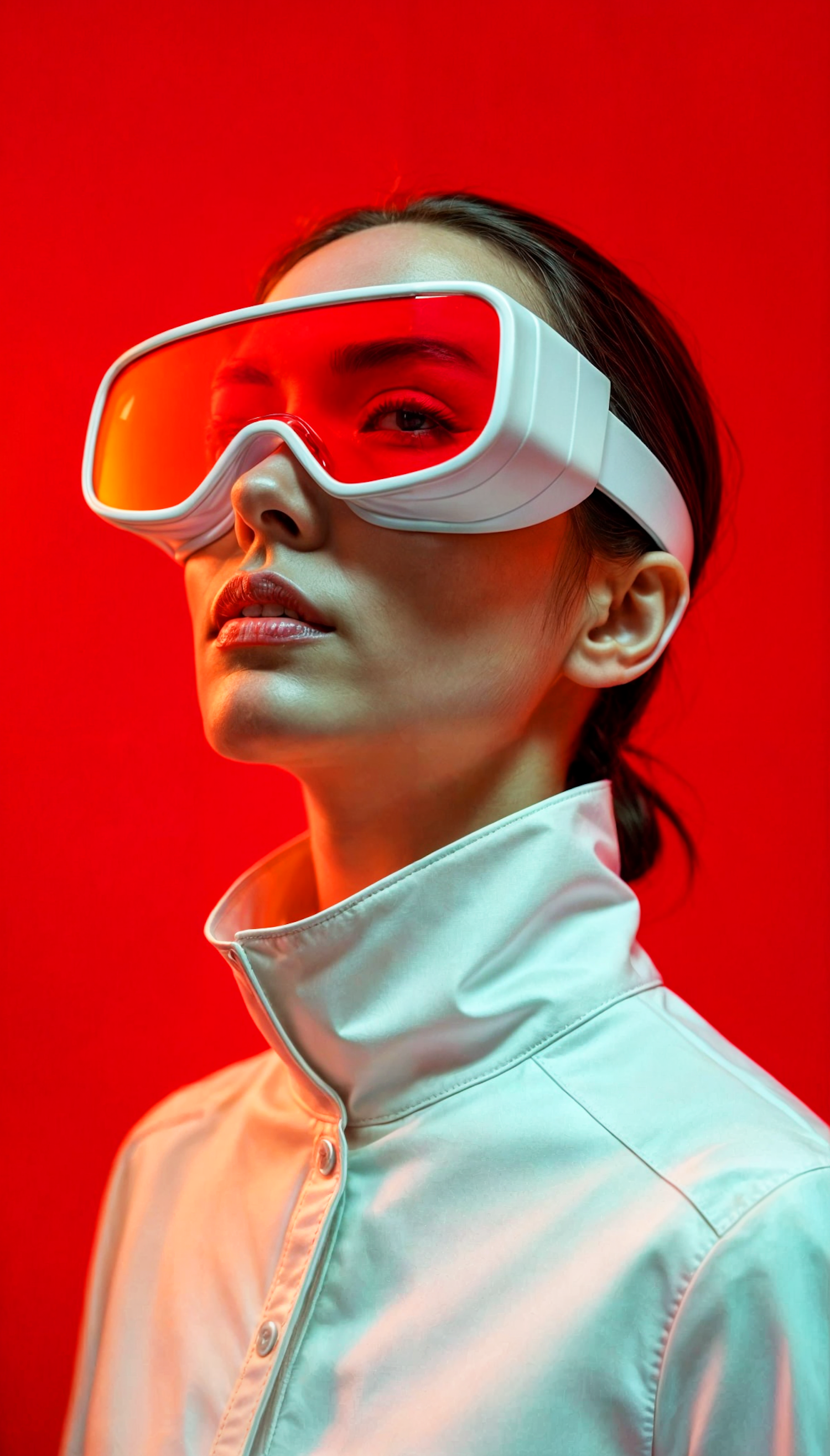Futuristic woman in white goggles with red lenses against a vibrant red background, exuding modernity and style.