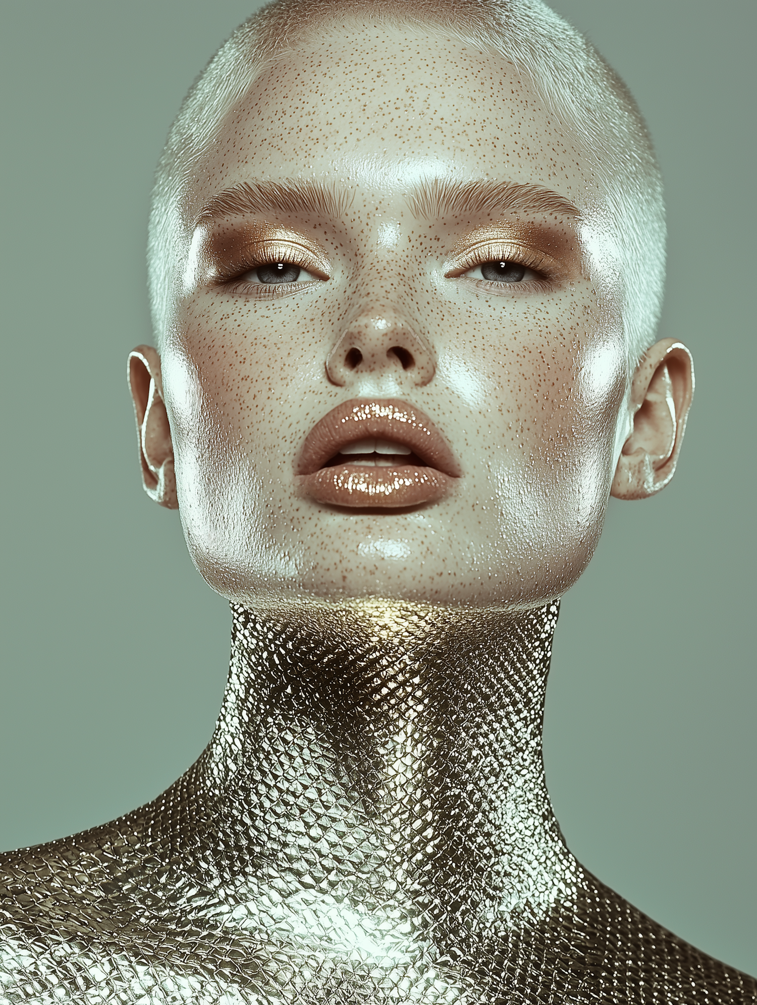 Artistic portrait with freckled face, glossy lips, and metallic textured neck. Modern and futuristic aesthetic in muted green tones.