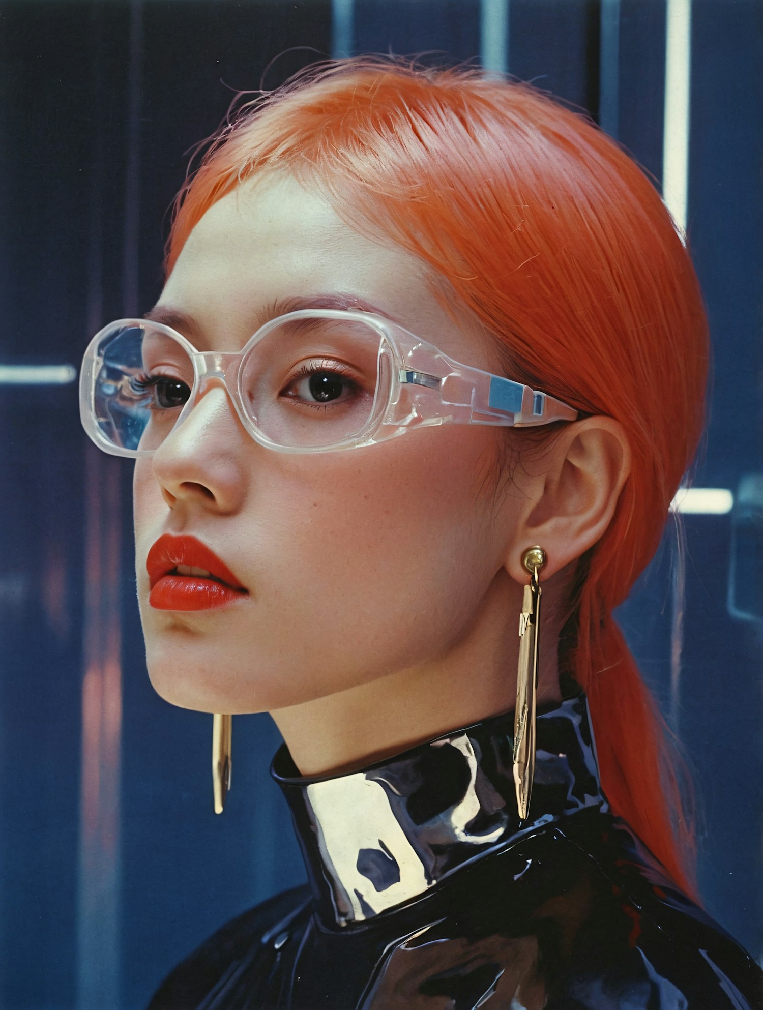 Portrait of a woman with orange hair, clear glasses, bold red lips, gold earrings, and a black patent leather outfit.