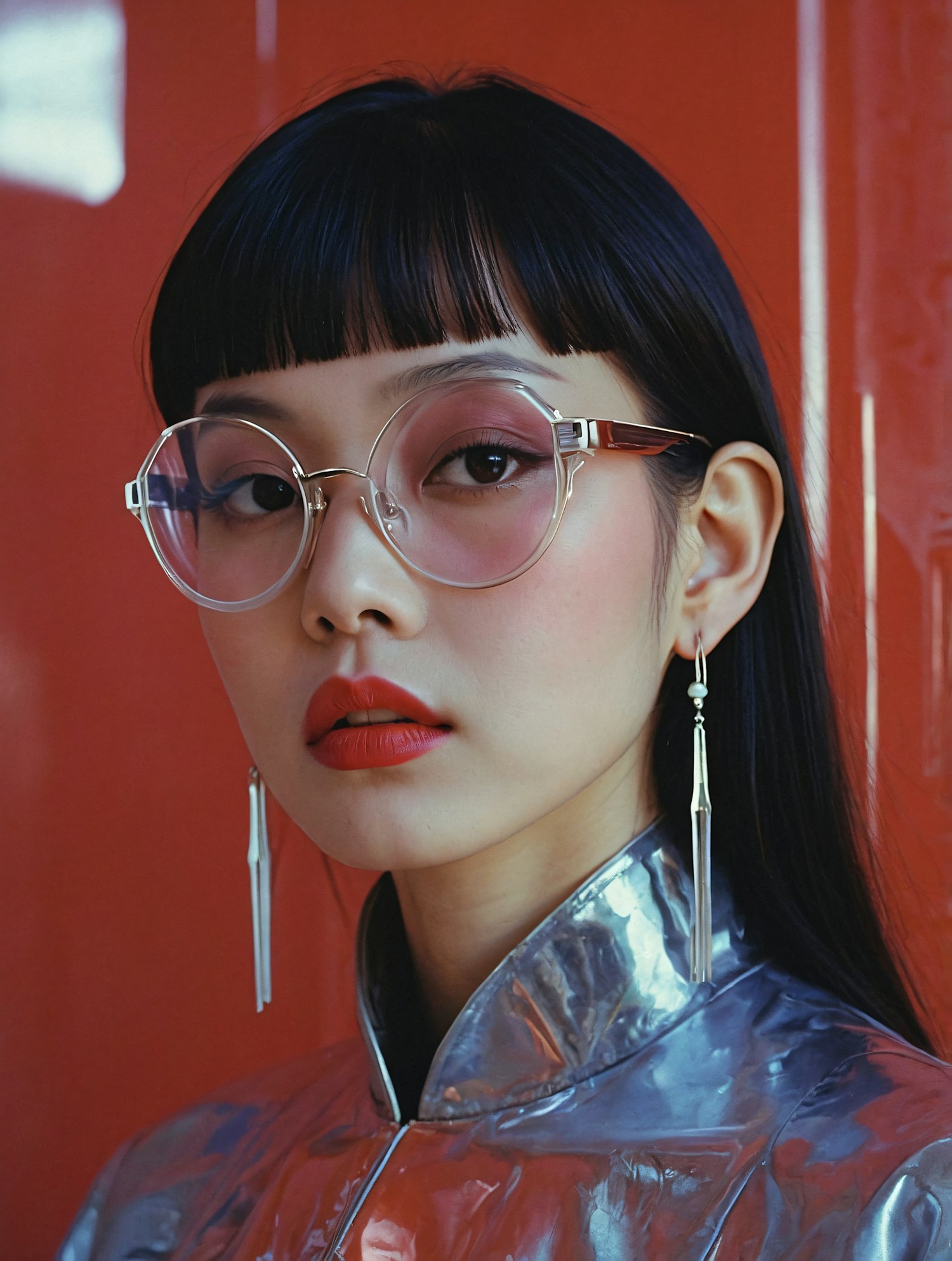 Stylish portrait of an Asian woman in round glasses, red lipstick, and a silver futuristic outfit against a bold red background.