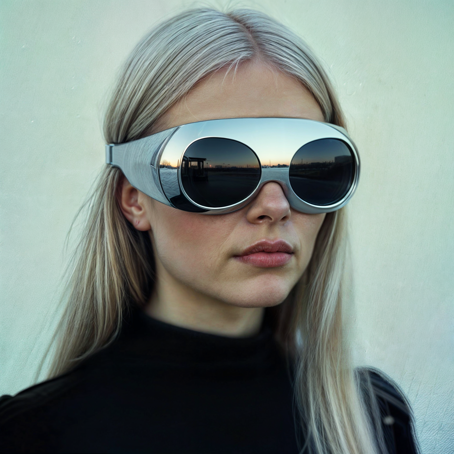 A woman with blonde hair wearing futuristic mirrored goggles, reflecting a sunset. Her neutral expression and black turtleneck add to the modern look.