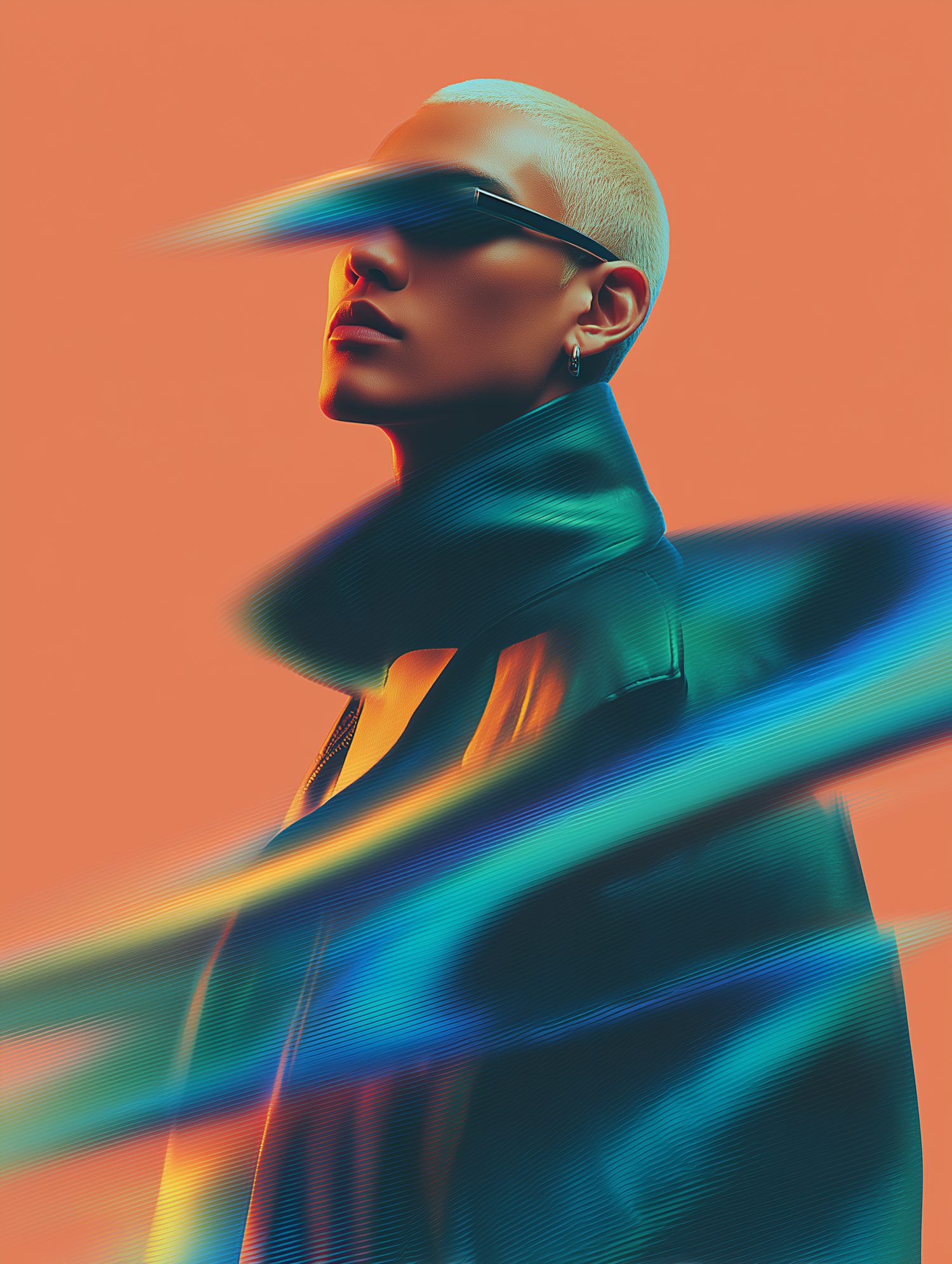 Stylized portrait of a person with platinum blonde hair, futuristic sunglasses, and dynamic light streaks on an orange background.