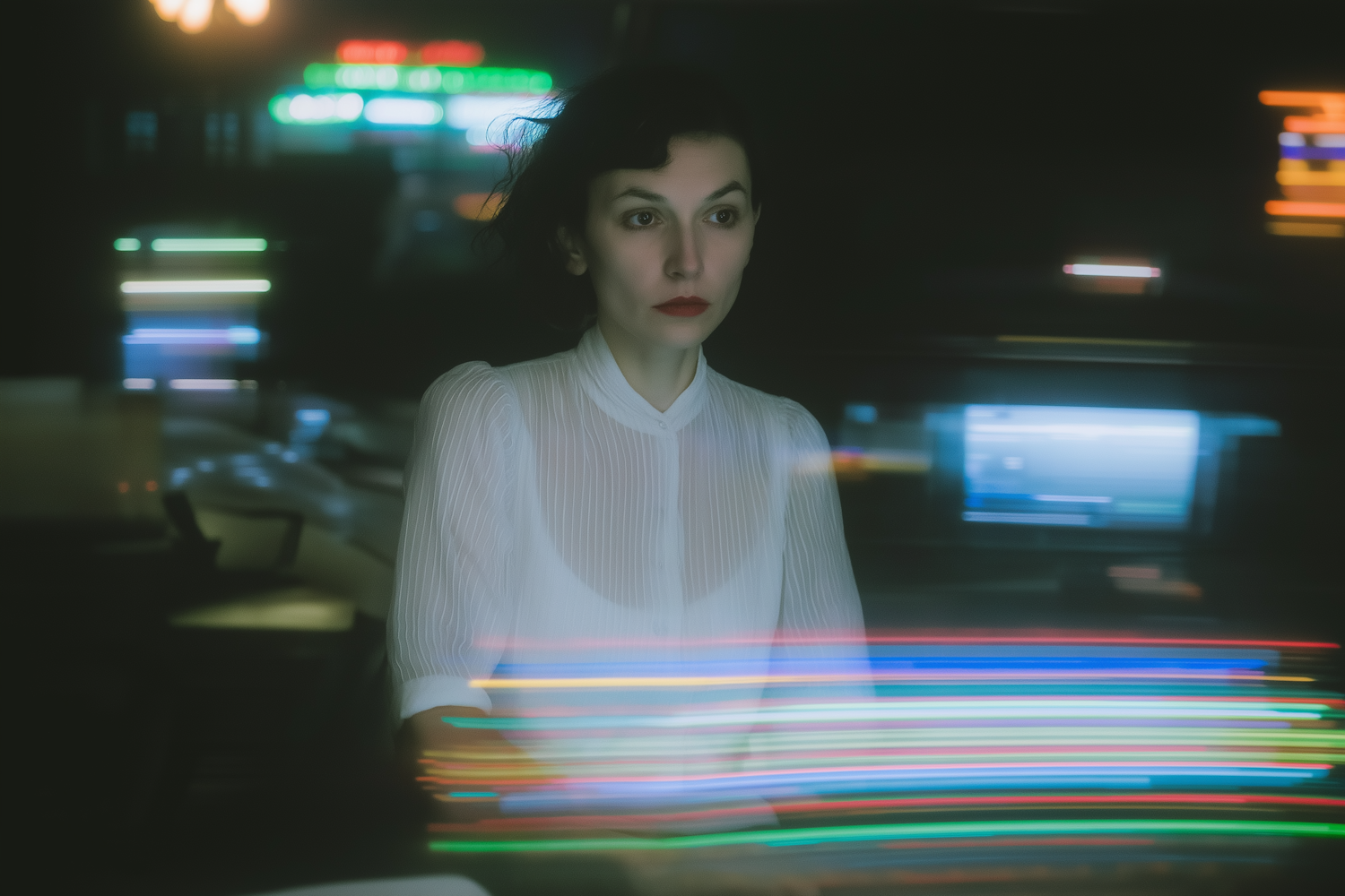 A woman in a white blouse sits in a dimly lit room with neon lights and colorful streaks, creating a cinematic and mysterious atmosphere.