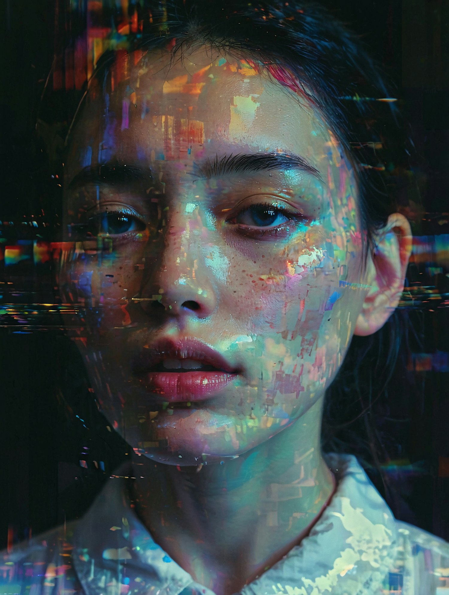 Close-up of a woman with digital glitch effects overlaying her face, creating a futuristic and surreal aesthetic.
