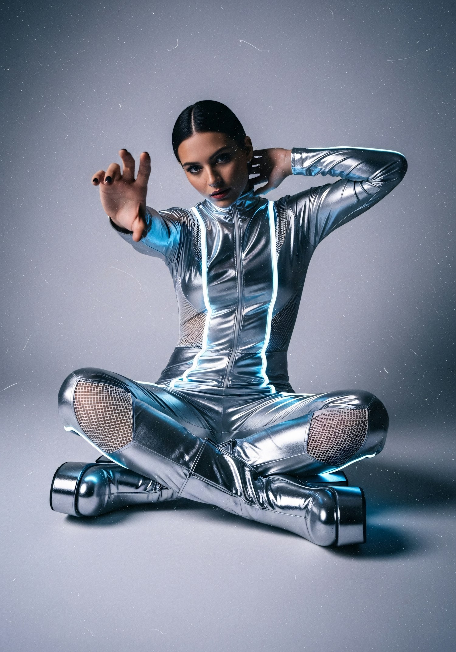A person in a futuristic silver bodysuit with glowing blue accents sits cross-legged, extending a hand forward in a dynamic pose.