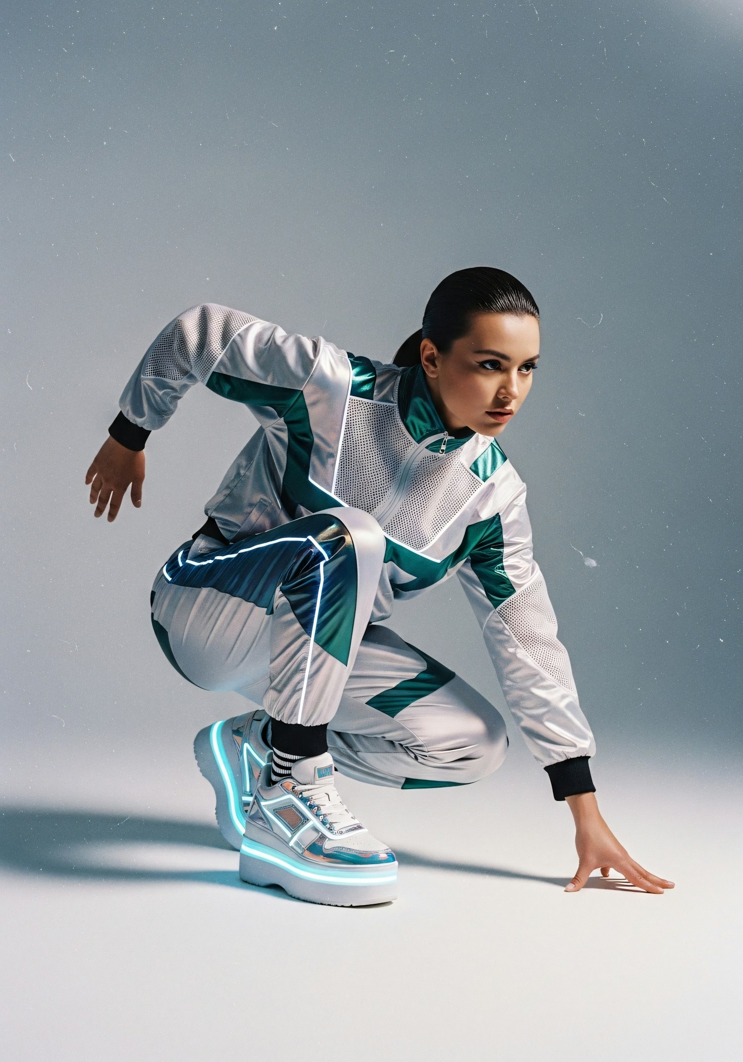 A person in a futuristic silver and green tracksuit crouches dynamically, wearing glowing platform sneakers against a neutral background.