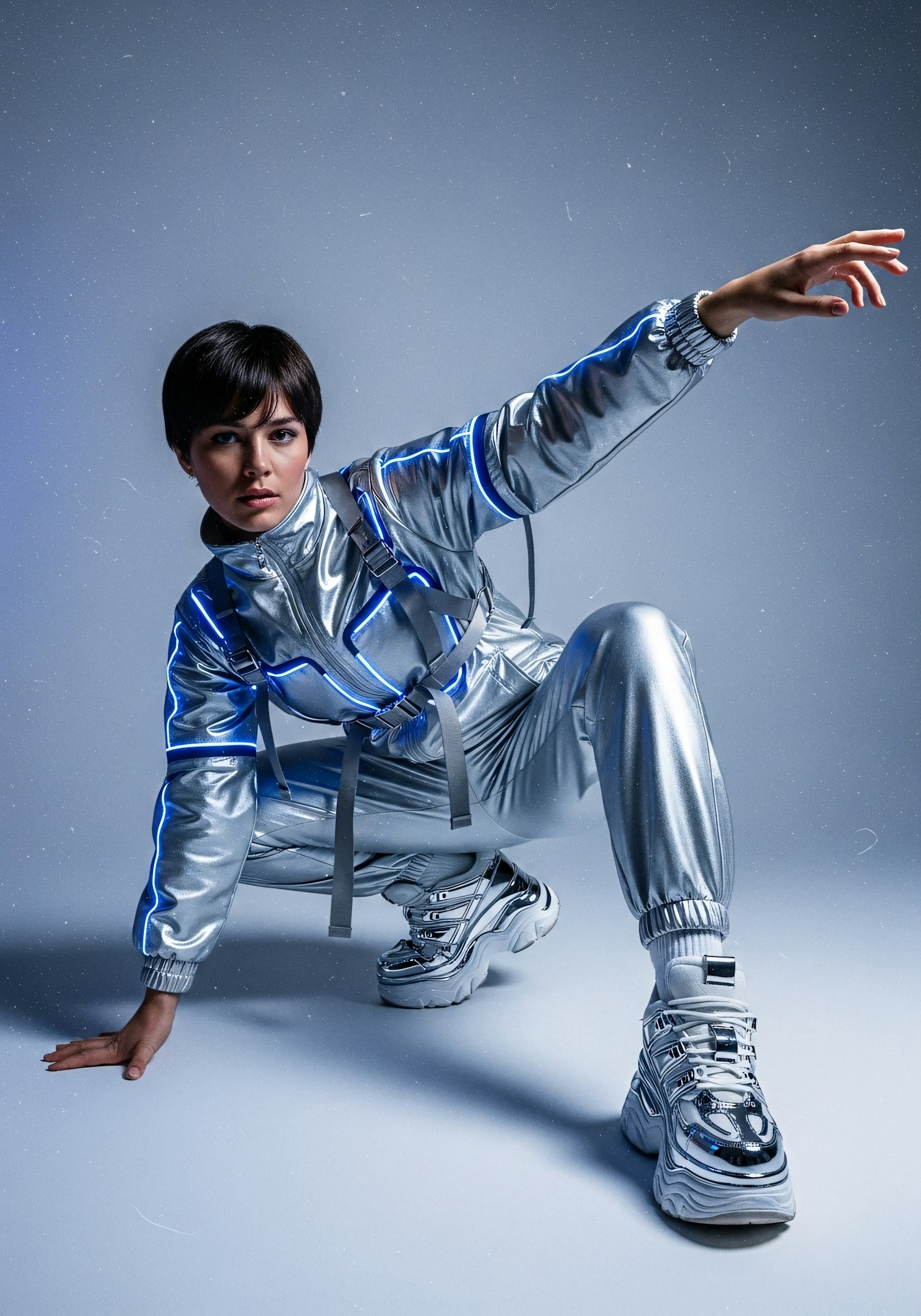 A person in a futuristic silver outfit with glowing blue accents strikes a dynamic pose against a light blue background.