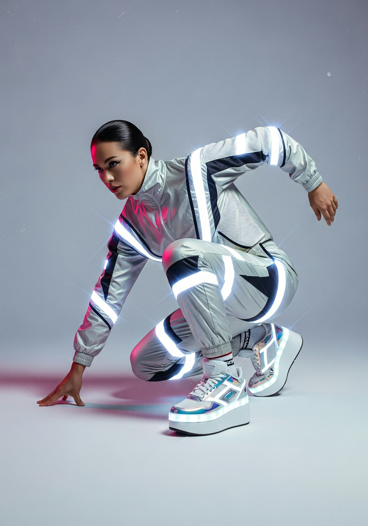 A person in a reflective silver tracksuit and glowing platform sneakers crouches dynamically against a gray background.